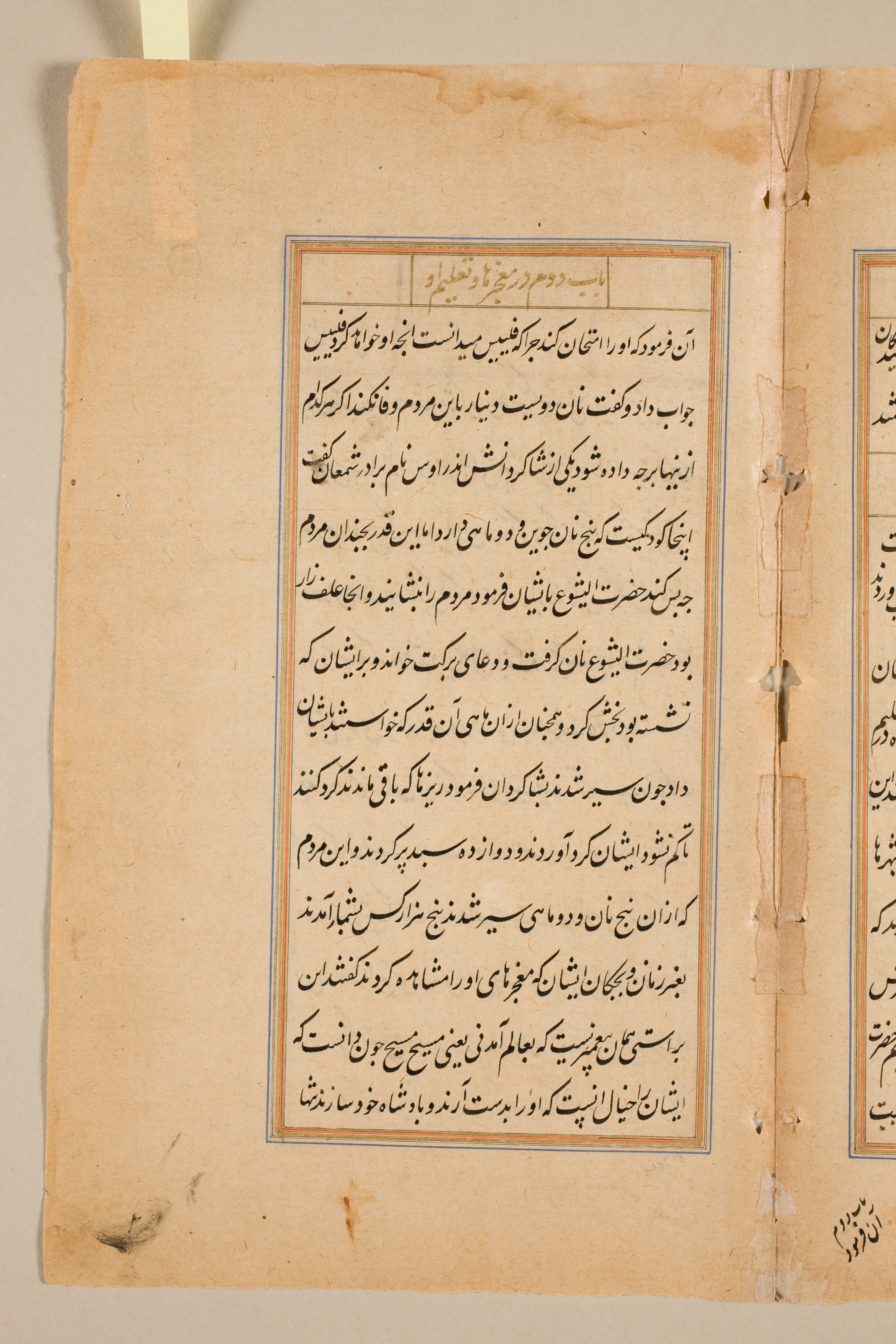 A yellowed manuscript page displays black ink text written in a non-Latin script, likely Arabic or Persian, organized in rectangular text boxes with orange and blue borders. A header with similar text spans the top. The aged paper has dark spots and tears. A strip of adhesive tape runs down the center. Partially visible, another text box appears to the right. A sliver of white background is visible behind the top and left edges of the manuscript.