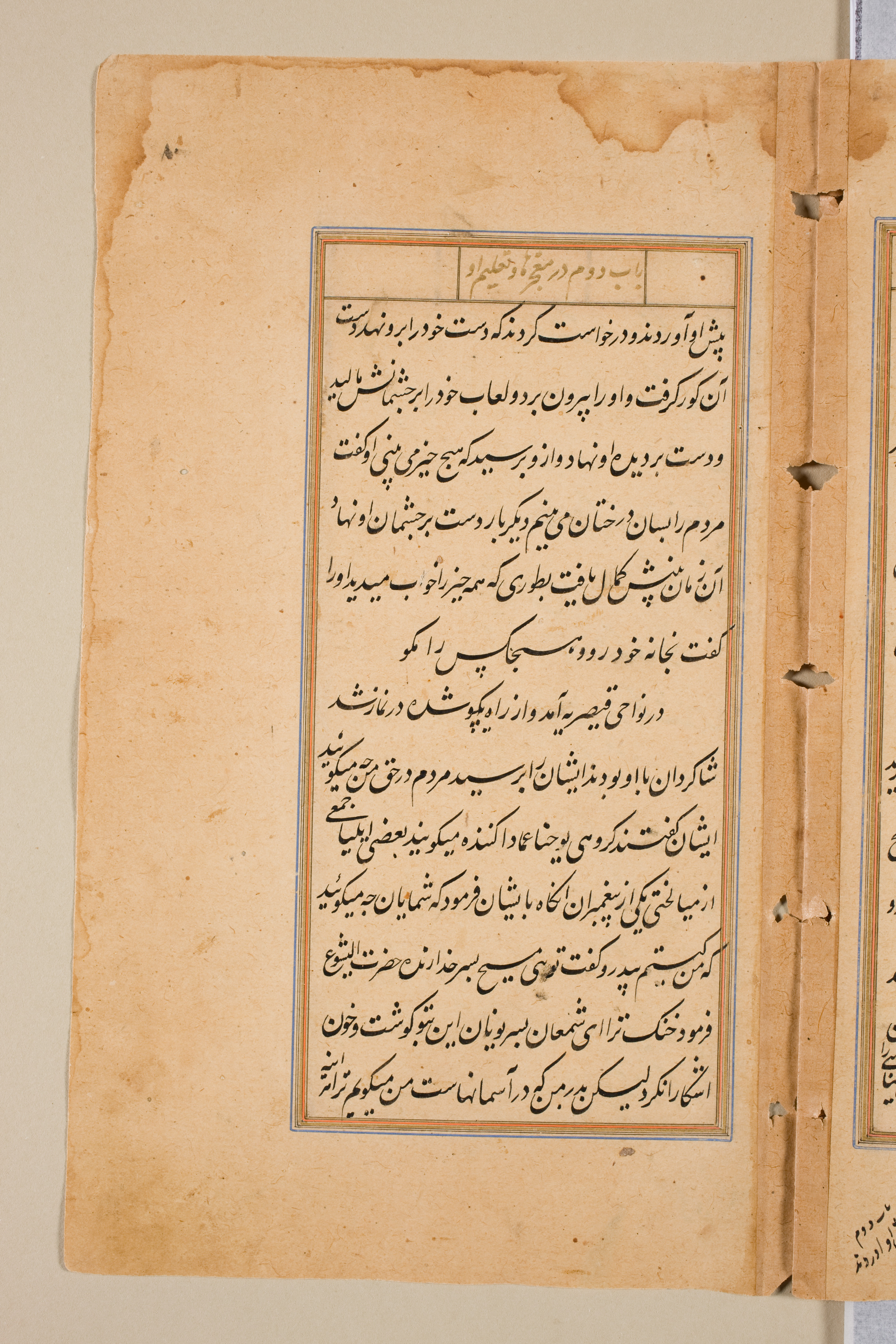 Yellowed book page with dark brown stains at top. A blue and orange border surrounds a central block of black text written in a foreign language, likely Arabic or Persian, consisting of 19 lines. A rectangular box with illegible text is above the central block. Three holes are punched along the right edge, with stitching visible. A partial view of another page is visible on the right.