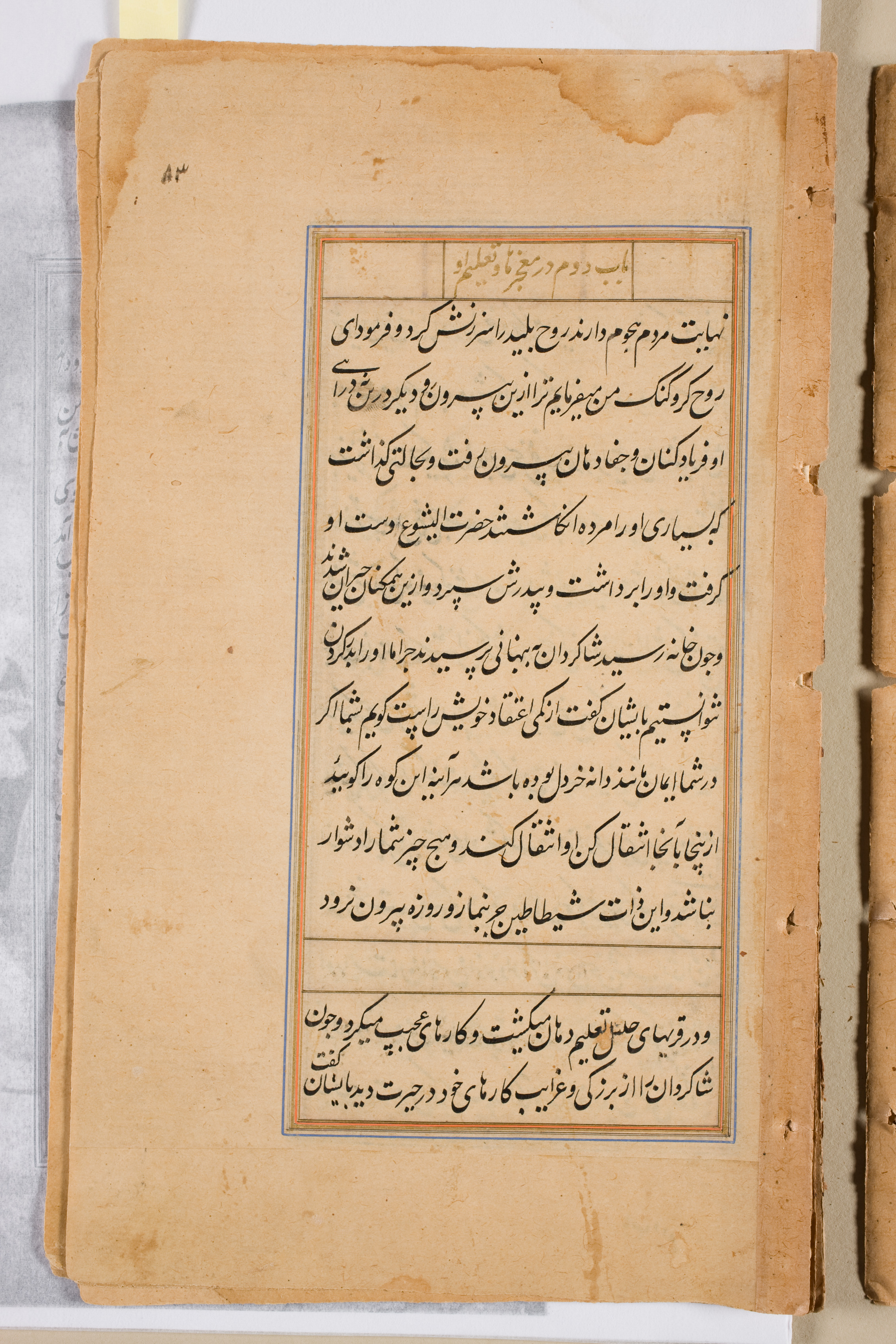 Yellowed, aged paper with darker edges and spots. A central text box contains black text in a foreign script, likely Arabic or Persian, with blue and orange borders. The text is divided into sections with blank spaces between. Dark brown discoloration and tears are visible on the page. The page appears to be bound on the right side.