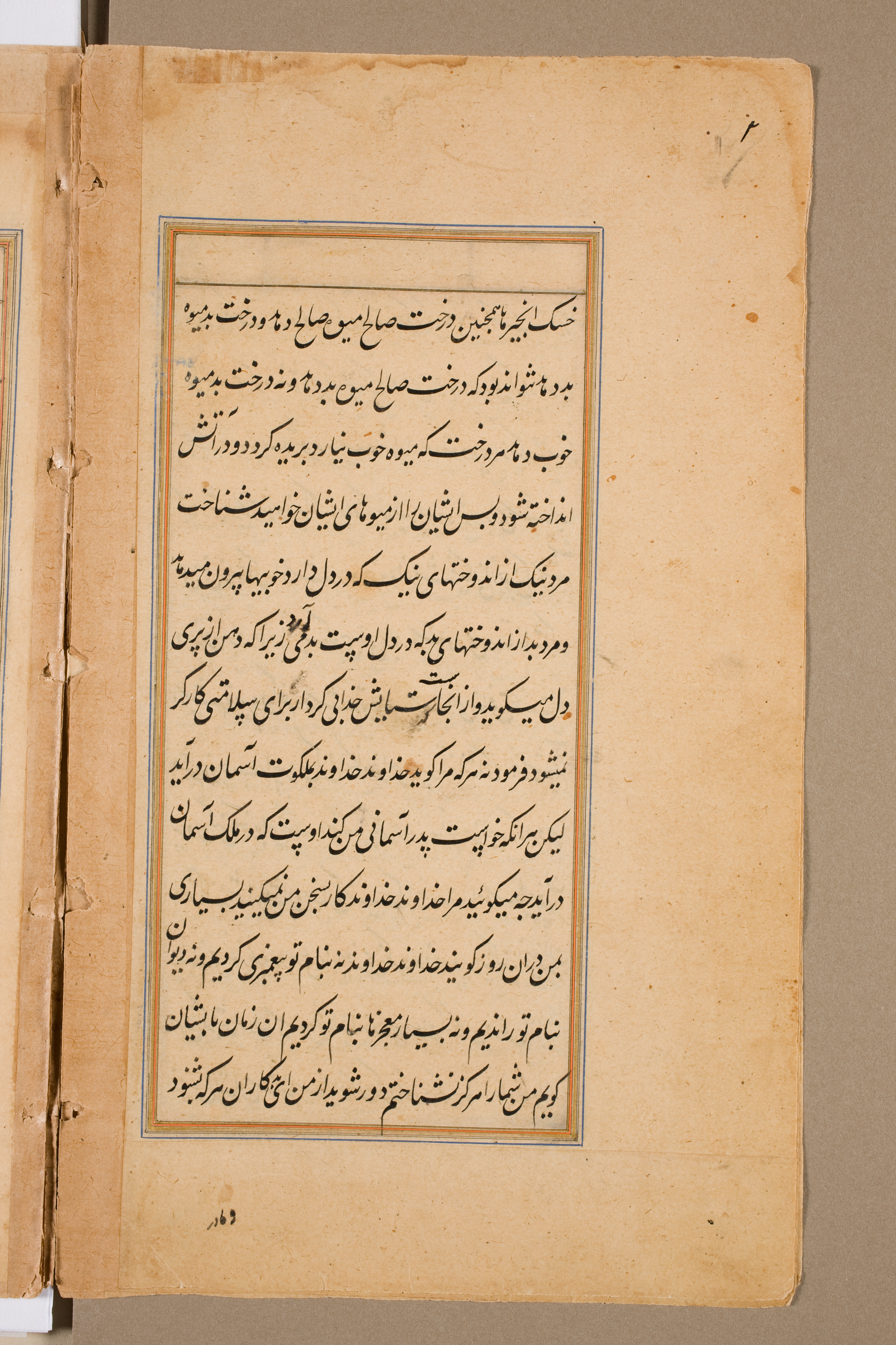 Yellowed, aged book page with visible signs of wear and tear. The page is rectangular with a darker yellow border around the edges. A thin blue and orange line frames a central block of text. The text is written in black ink and appears to be in a non-Latin script, likely Arabic or Persian. The script is cursive and dense, filling the central block. Small dark spots and stains are scattered across the page. A darker area is at the top and a lighter area at the bottom left. A partial page is visible on the left edge. The background behind the page is solid gray-brown.