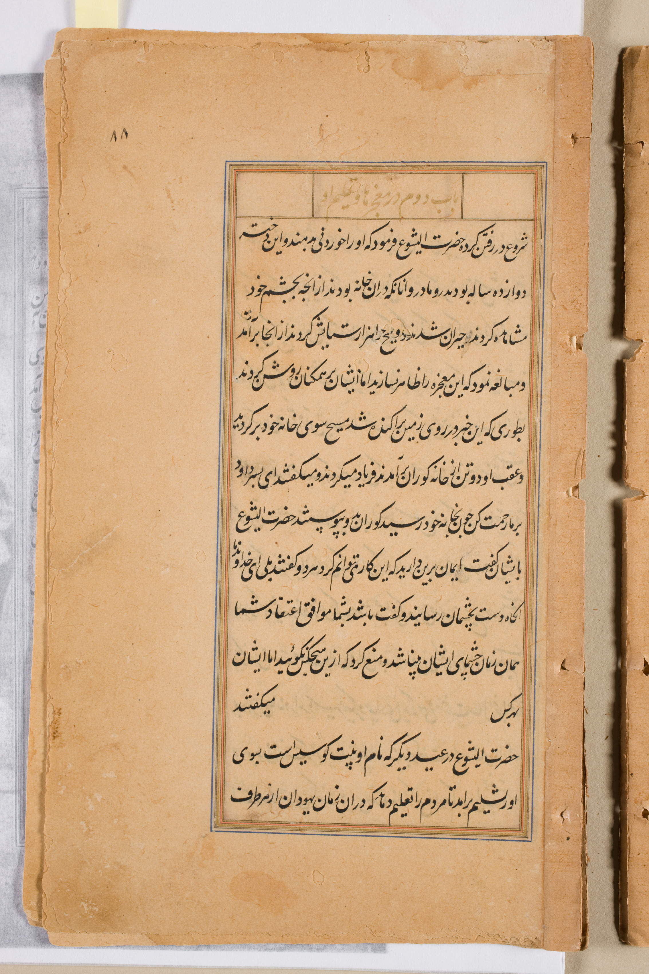 Yellowed, aged paper with darker edges and rough texture. A central rectangular text block with blue border. Within the border, black and brown ink text written in a non-Latin script. The script is likely Nastaliq, written in a right-to-left direction. Small tears and discoloration along the edges, with darker spots. A partial view of another page on the right. The background appears to be a light-colored surface, possibly paper or a table.