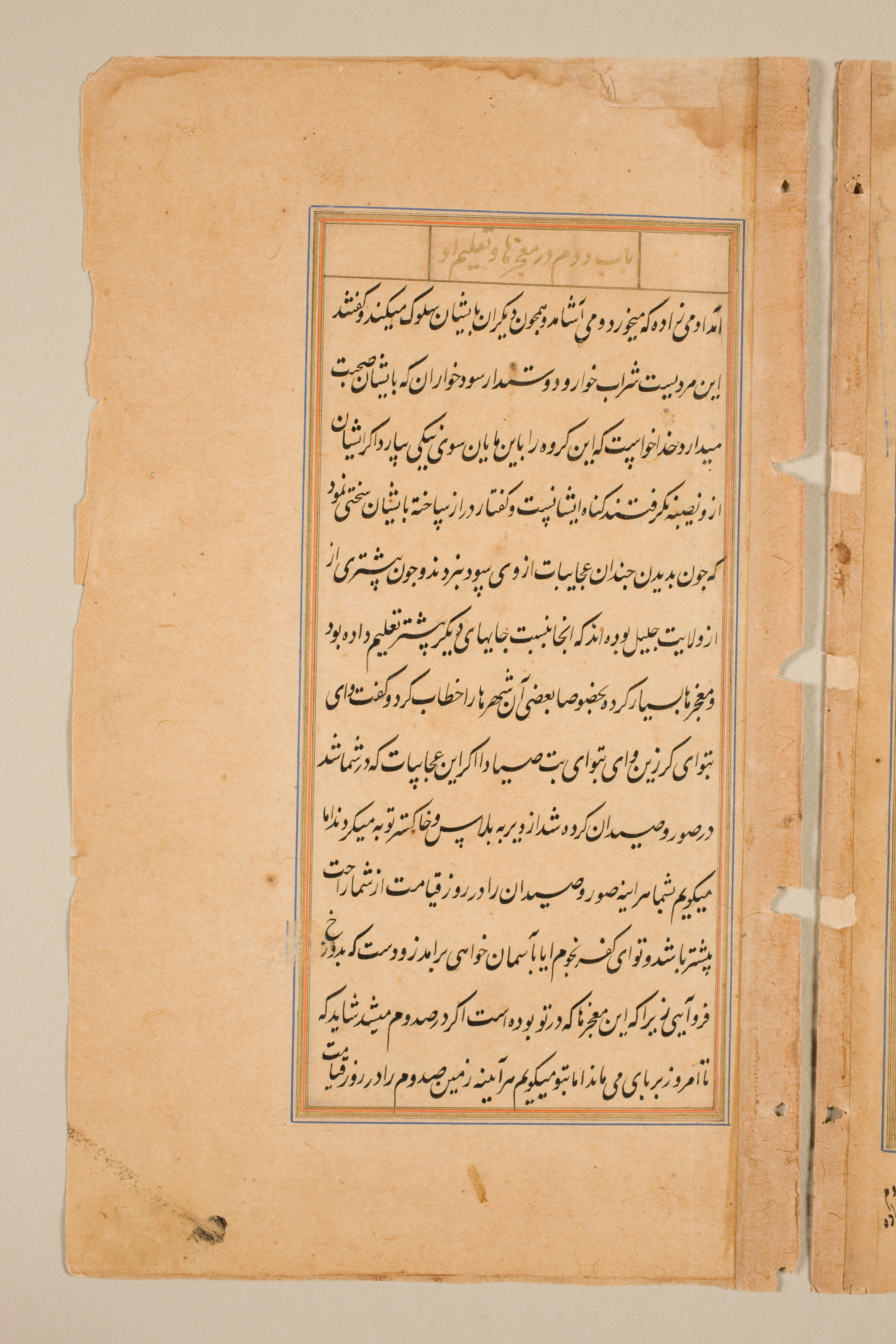 A yellowed, aged text page with a rectangular border, written in black ink with some faded orange writing at the top; the text is in a non-Latin script; blue and orange lines form the border; the paper appears worn and torn; binding visible on right side.