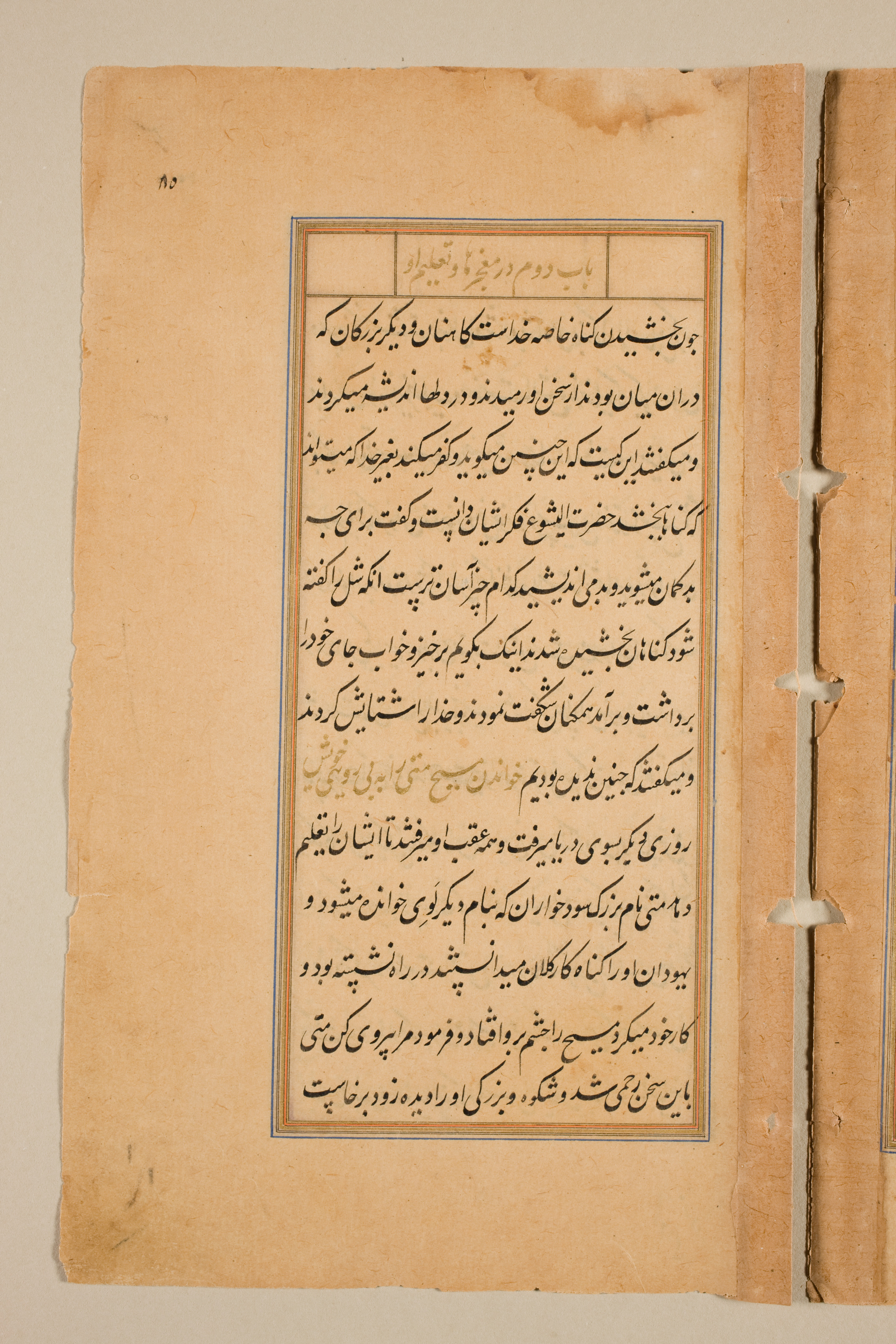 A yellowed, aged, rectangular piece of paper with a blue border around a block of writing; the writing consists of 33 lines of black text written in a foreign language; a small, rectangular box of foreign text sits atop the block of text; four holes and accompanying creases run down the right side; the edges are rough and worn; a beige, uniform background.