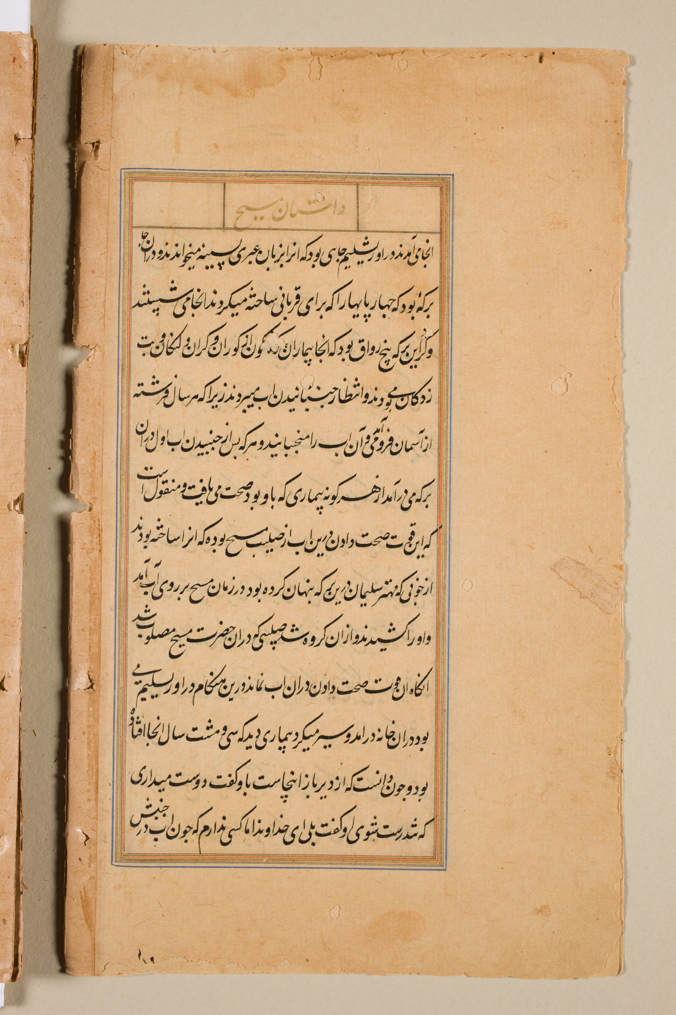 Yellowed page with Persian script. Blue and orange border around main text area. Text written in black ink, some with decorative elements. Small header section with text. Page appears aged, with frayed edges and visible wear. Partially visible adjacent page on left. White background.