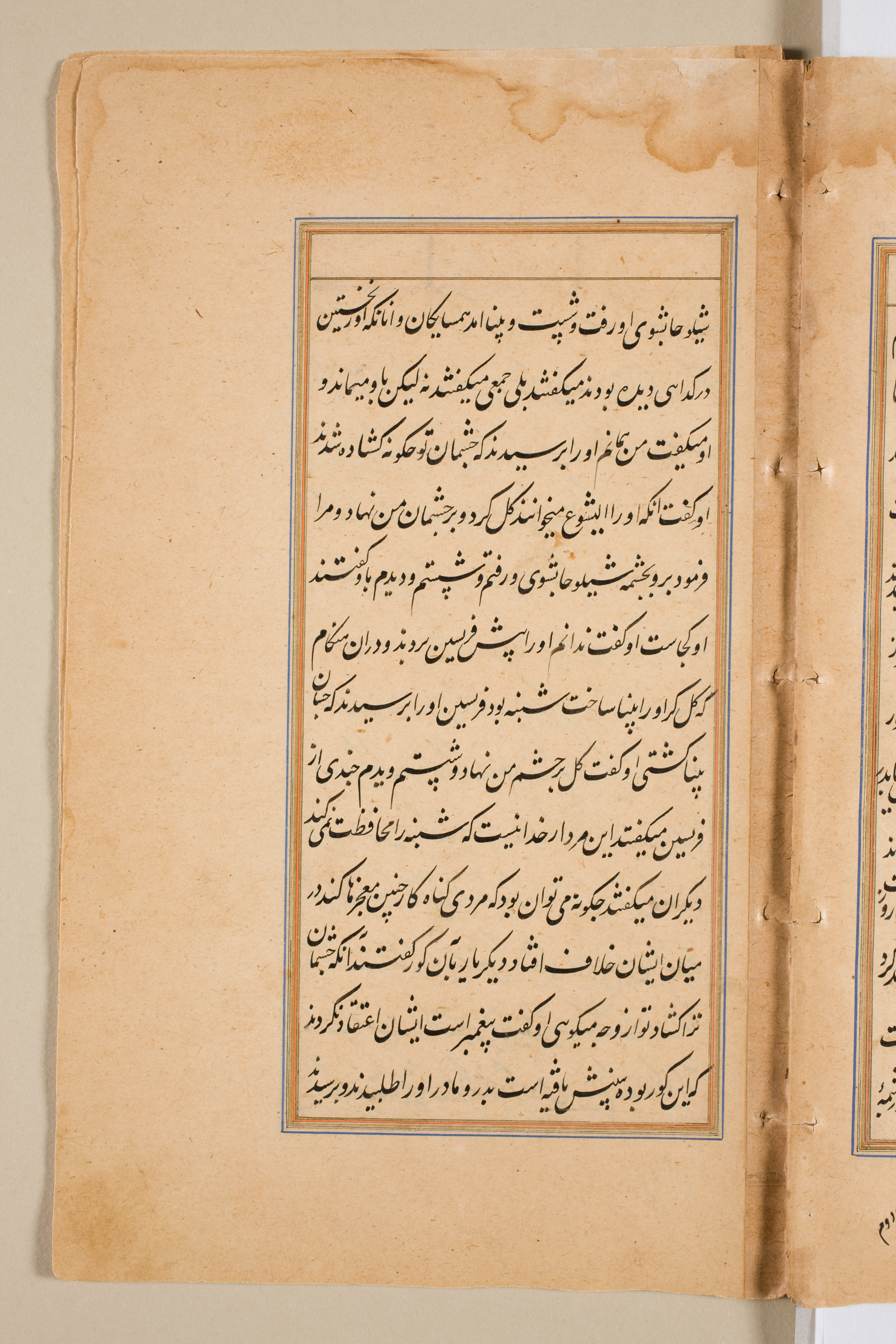 Yellowed, aged paper with darker edges and visible signs of wear. A central rectangular text box with blue and orange border contains black, handwritten text in a non-Latin script. The text fills the box densely with no images or illustrations. The right edge shows a partial view of another page. The background is plain and off-white.
