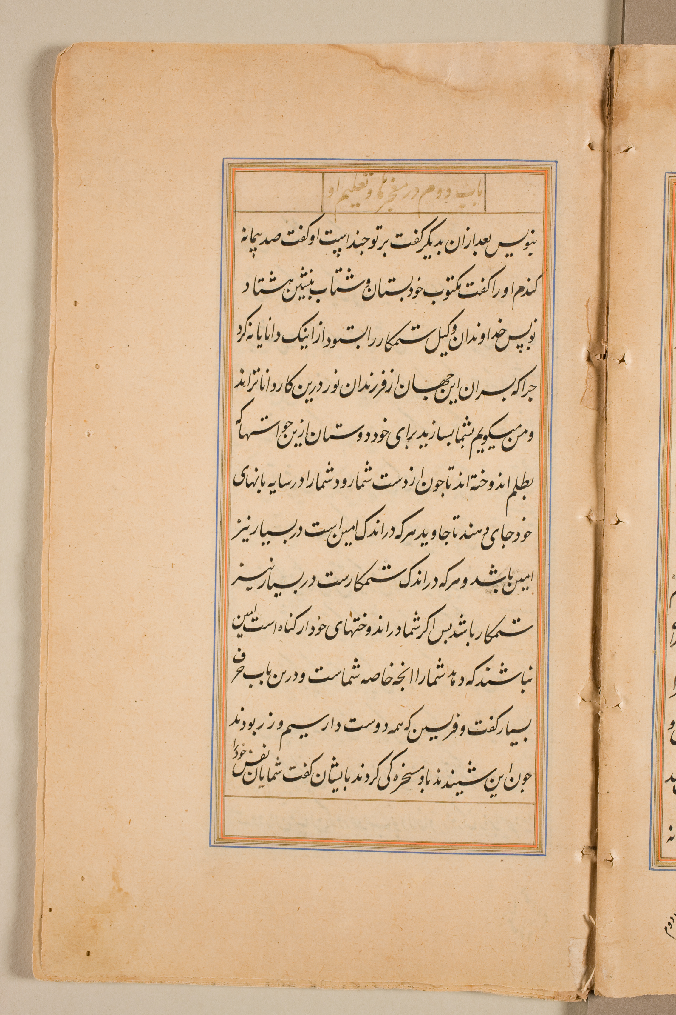 The image shows an open, aged book with yellowed pages. The left page is fully visible, while the right page is partially visible. The left page contains a central text box outlined in blue and orange. The text box is filled with black Arabic script. A smaller section of text is above the main text box, also in black Arabic script. The book's pages are yellowed and worn, with darker spots and discoloration around the edges. The pages appear to be made of a rough, aged paper. The book is open on a plain white surface, with a slight shadow visible on the left side.