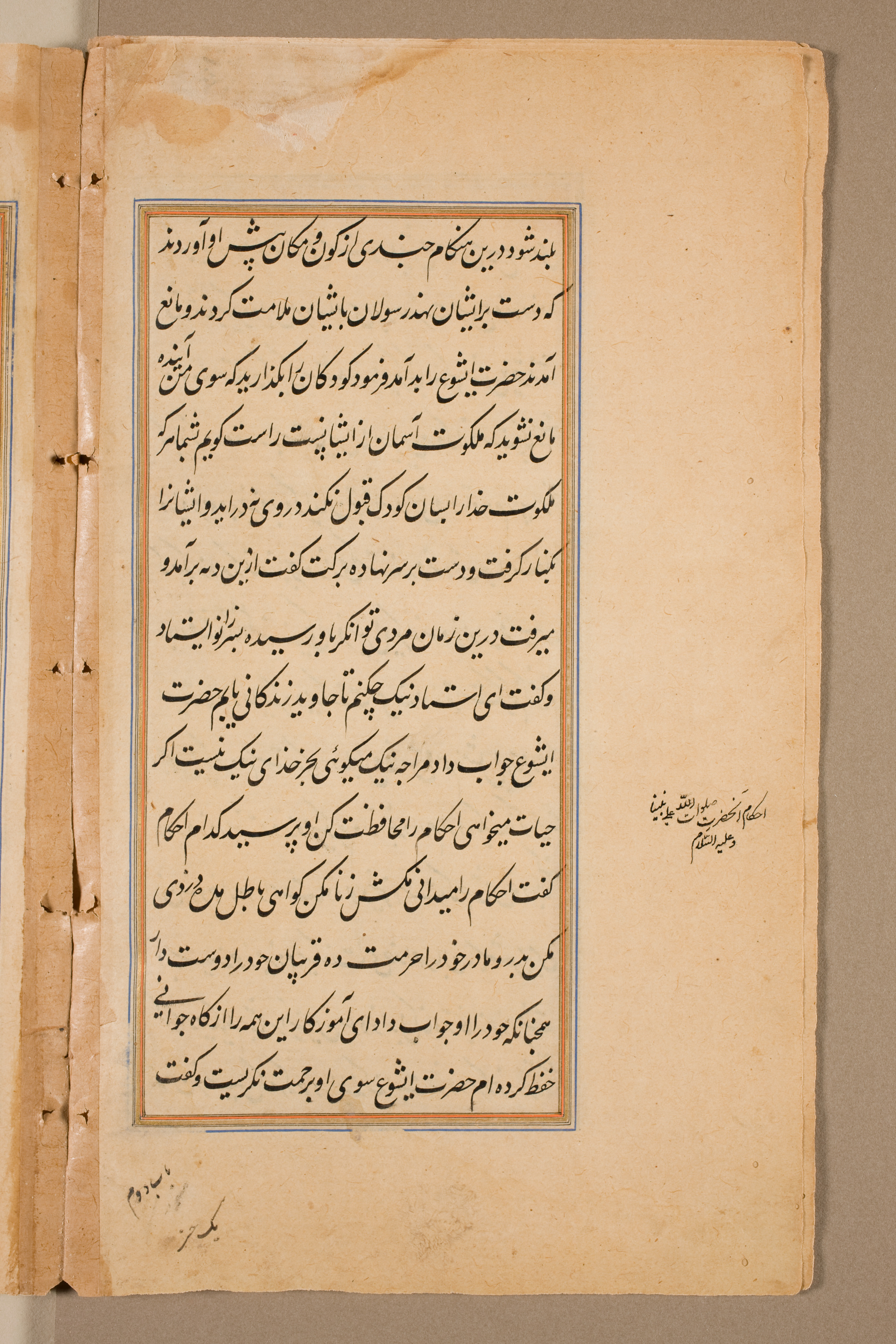 Yellowed page with black ink writing in a non-Latin script, possibly Arabic or Persian, arranged in lines. The text is enclosed within a rectangular border with a thin blue and orange outline. The border around the text has some faint yellow markings. The page appears aged, with visible signs of wear, including darker spots, tears along the edges, and holes along the left edge where it has been bound. There are also some handwritten notes in the same script on the right side of the page. The background behind the page is gray.