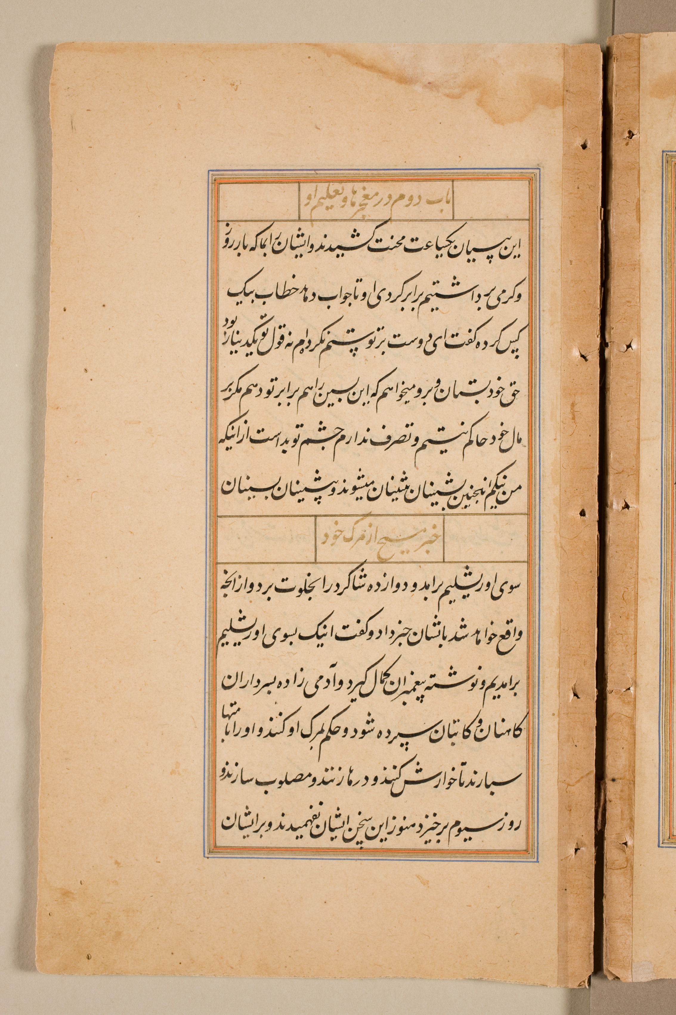 Yellowed, aged book page with dark brown and black stains. The page is open, with a right edge that is uneven and rough. The majority of the page contains a central rectangular block of text in black ink in a foreign script, framed by two thin lines, one blue and one orange, with a small rectangular box above and below the text. The script is written in a language that appears to be Arabic or Persian, with intricate calligraphy and diacritical marks, and the text is densely packed with no discernible images or illustrations. The page's background is off-white, possibly with darker shadows around the edges. Another page is visible on the right edge.