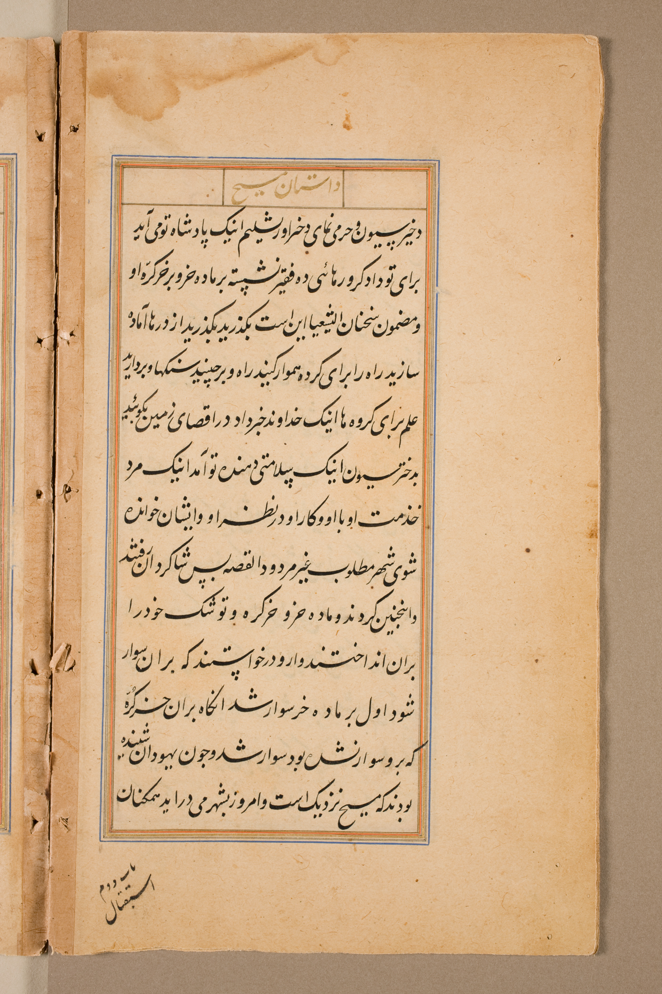 Yellowed, aged paper with darker spots. A central text box contains black script in a non-Latin alphabet. A double border frames the text box; one blue, one orange. The text box is long and rectangular, oriented vertically. Most of the page is empty. The left edge shows binding along a spine. The adjacent page is partially visible on the left. The background behind the paper is gray-brown.