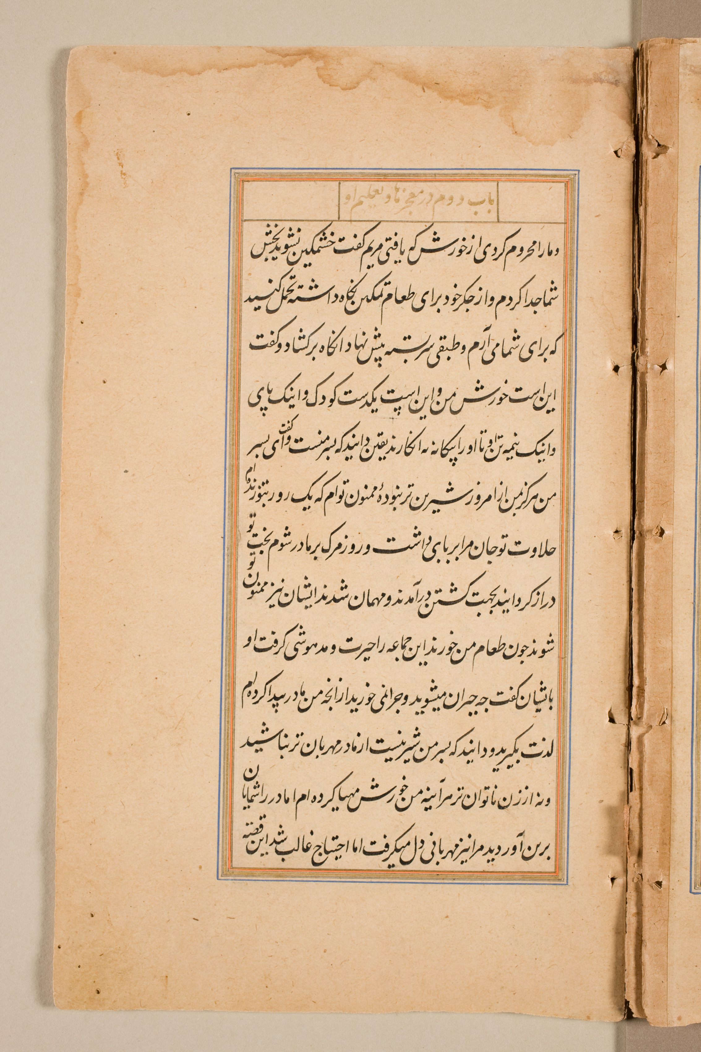 Text page with black ink writing on yellowed paper. The text is written in a foreign language, possibly Arabic or Persian, and is arranged in lines. A thin blue and orange border surrounds the text, which is divided into sections. The paper is worn and torn in places, with darker spots and holes along the edges. The right edge of the page has three holes with stitching, and the right page is partially visible. The background is a plain off-white color.