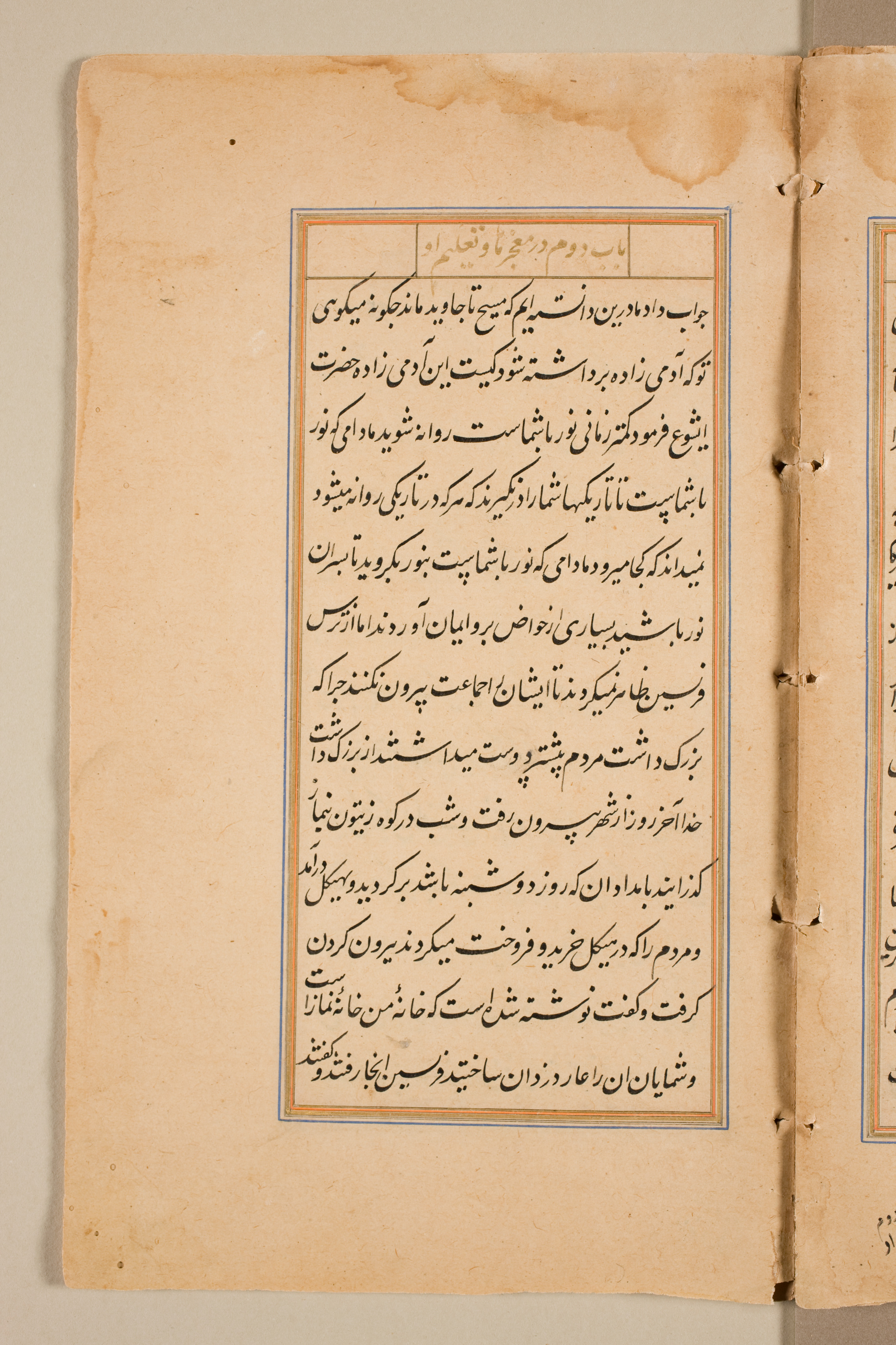 The image shows a yellowed, aged text page with a rectangular border in blue and orange ink. The text within the border is written in black ink in a non-Latin script, likely Persian or Arabic. The text fills most of the page, with a smaller section at the top, possibly a title or header, separated by a line. The page appears to be from a book, with another page visible to the right. The pages are bound with three holes and string. The background behind the pages is a plain beige color.