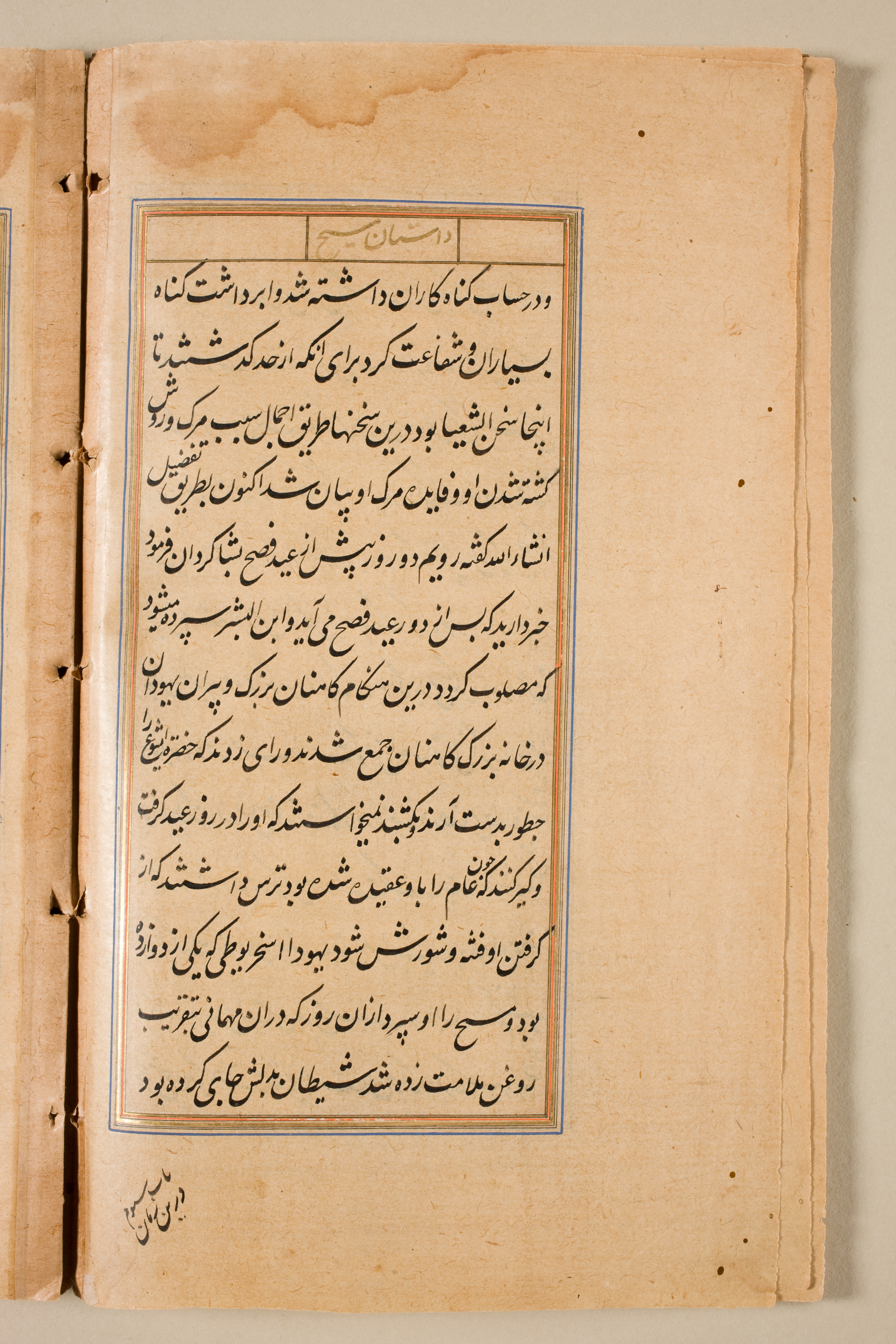 Yellowed, aged paper with darker spots and stains. Black ink writing in a foreign script. A blue and orange border around the text. The border has a single line of text at the top. The page is bound on the left side with holes and stitching. The background behind the page is light gray.
