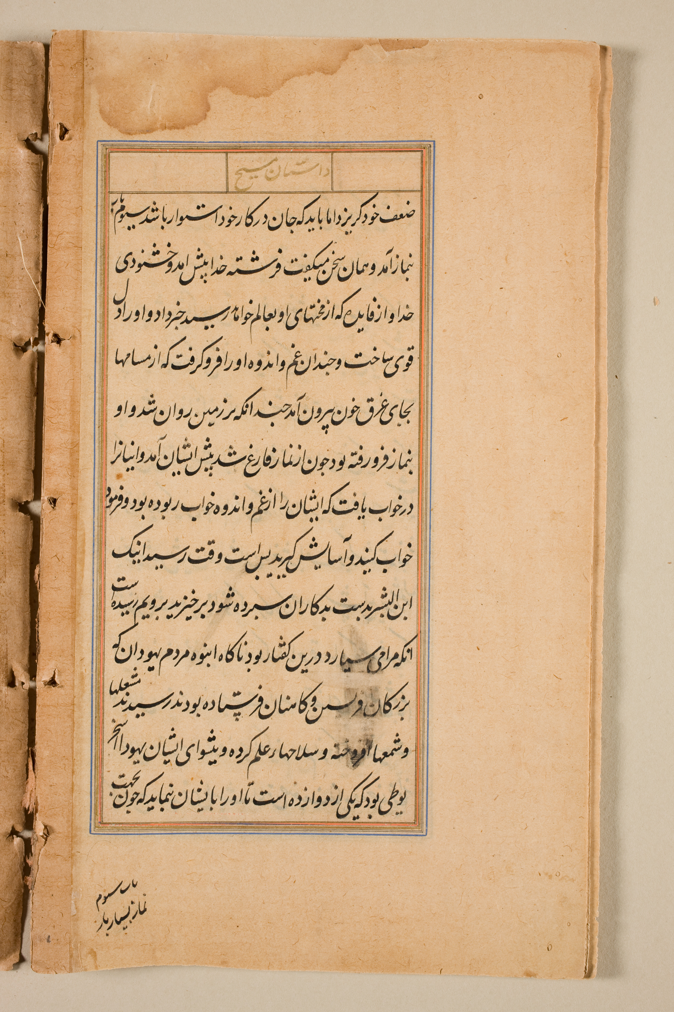 The image shows a yellowed, aged page with a rectangular text box containing black calligraphy written in a non-Latin script. The text box has a thin blue border and a thicker orange border. The page is slightly torn at the top and has visible signs of aging, including darker spots and discoloration. The left side of the page appears to be bound with a stitch or a string. The background of the image is a plain off-white color. The text within the box consists of 33 lines of writing. The script appears to be Nastaliq or a similar style. The page is likely from a book, possibly a religious or historical text. The overall appearance suggests an antique or vintage item.