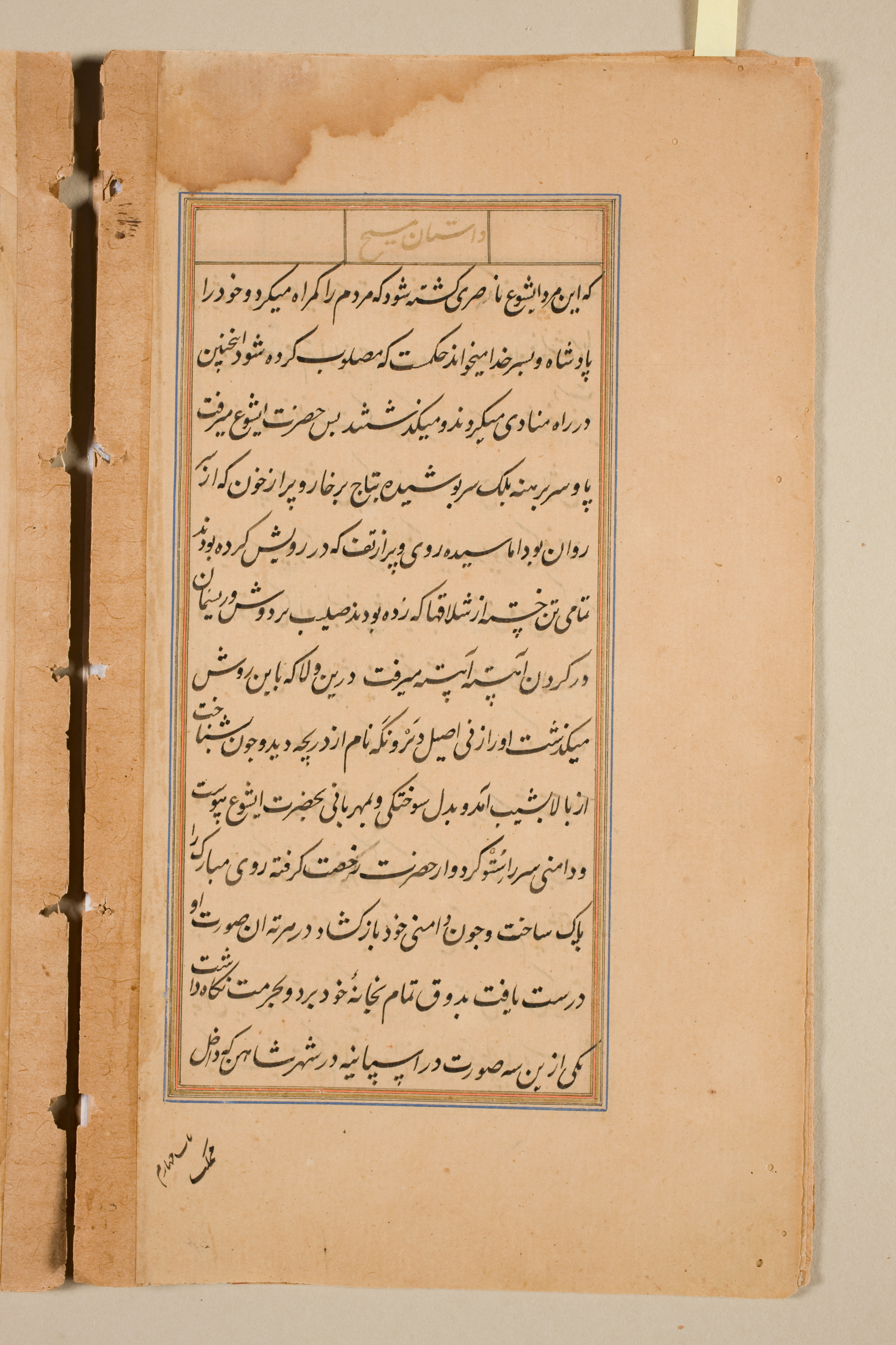 The image shows a page from a book with handwritten text. The page is yellowed and worn, with visible signs of aging and use. * The page is rectangular in shape. * It has a central rectangular text box containing black ink writing in a non-Latin script, likely Arabic or Persian. * The text box is outlined by a thin blue and red border. * A thicker blue and red border surrounds the text box. * The top of the page features a small rectangular section with writing. * The page has a rough, aged appearance with darker spots and tears along the left edge. * The left edge has four holes with metal rings or rivets through them, suggesting the page is part of a bound book. * A small piece of tape is attached to the top-right corner of the page.