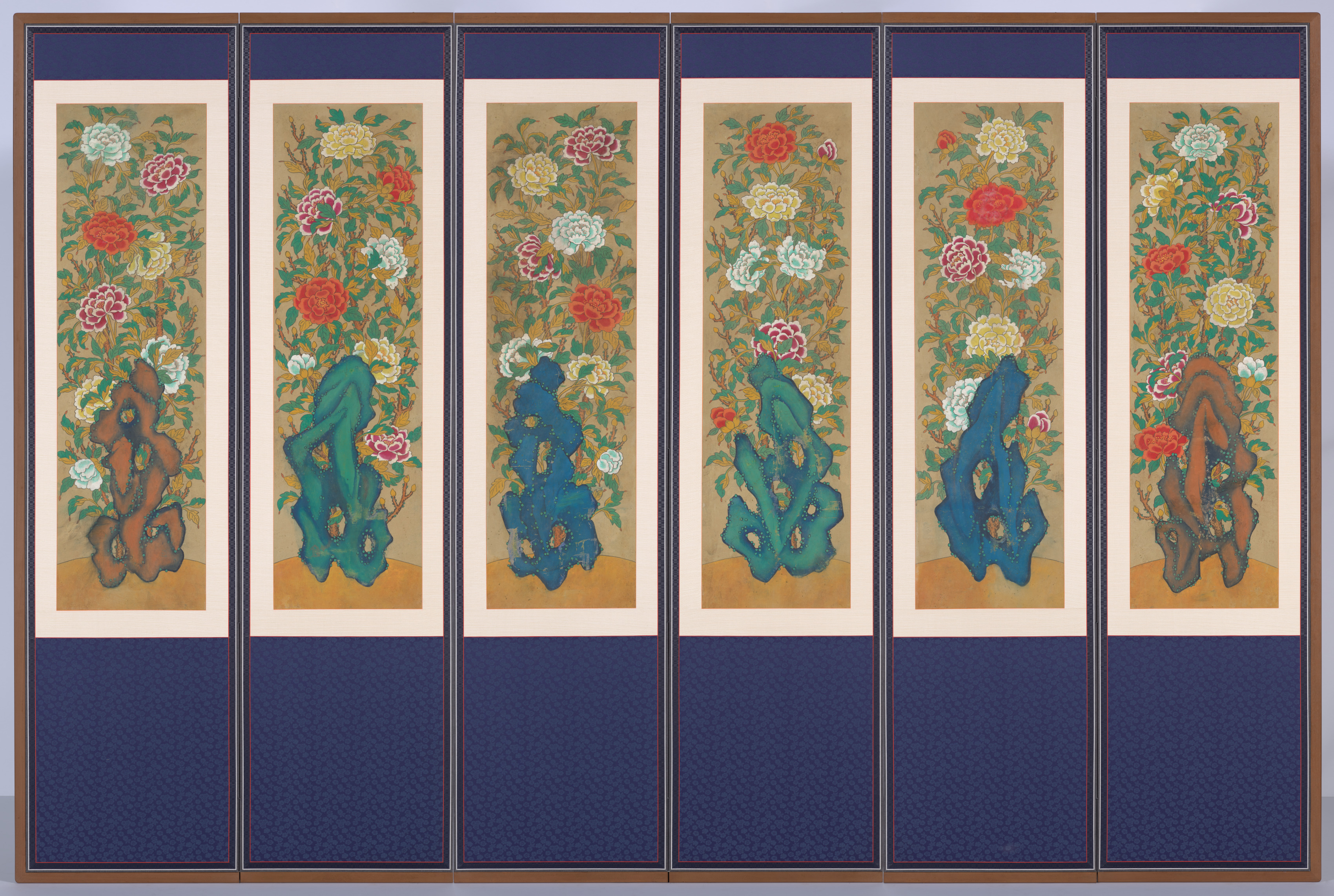 The image depicts a six-panel folding screen. The top portion of each panel features a tan background with colorful peonies and greenery. The bottom portion of each panel is navy blue. Each panel has a thin beige border around the top artwork and a thicker brown border around the entire panel. The peonies are pink, white and red; the leaves are green. The rocks are depicted in shades of brown, teal, and blue. The artwork is titled "Peonies and Rocks". The image is symmetrical with the first and last panels mirroring each other. The second and fifth panels are similar and the third and fourth panels are similar.