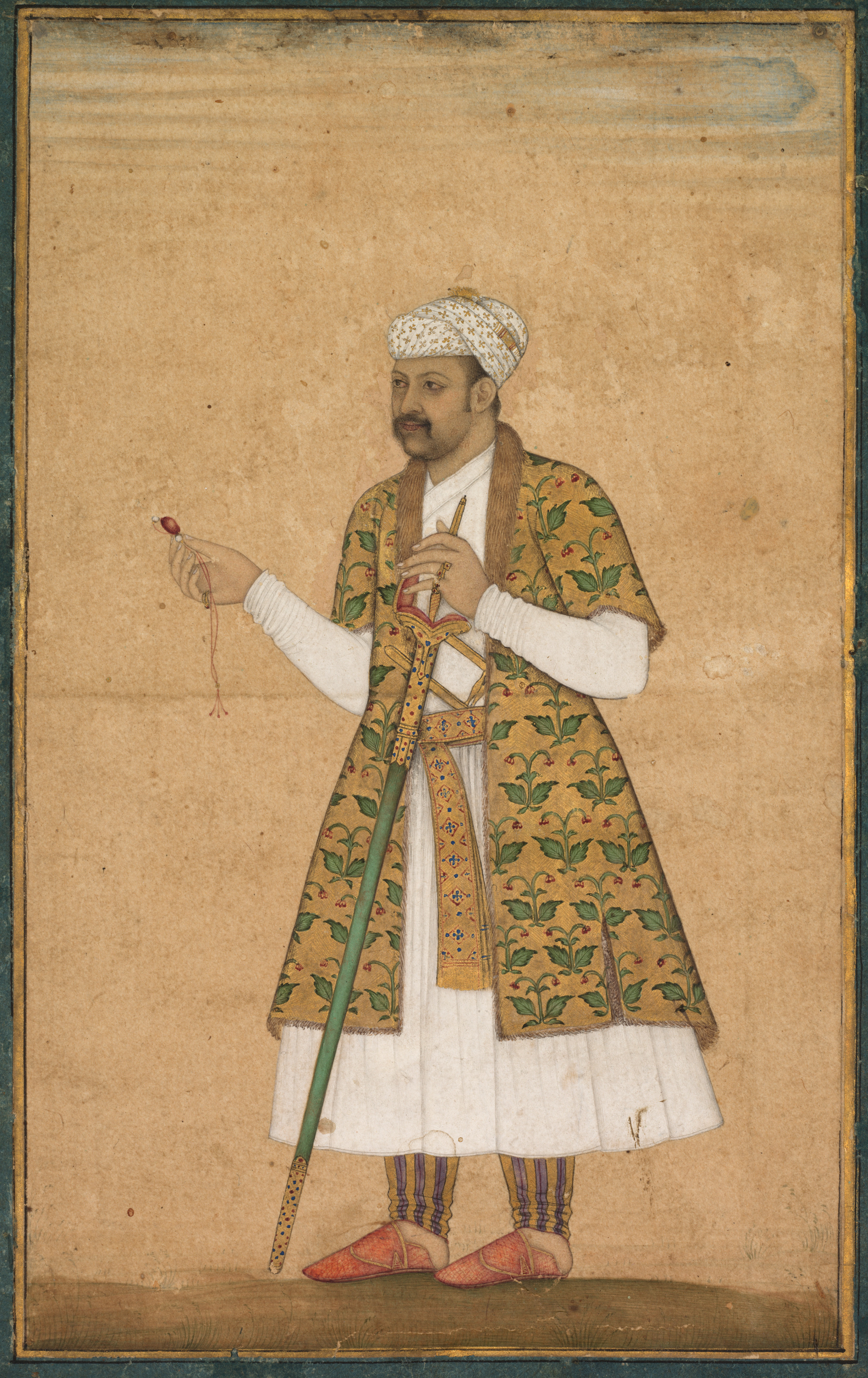 Man wearing a white robe and patterned shawl, holding a spinel and sword. The man has a mustache and is wearing a white turban. He is also wearing striped pants and red shoes. The shawl has a green and red leaf pattern on a brown background. The spinel is red. The sword has a green handle. The background is light brown.