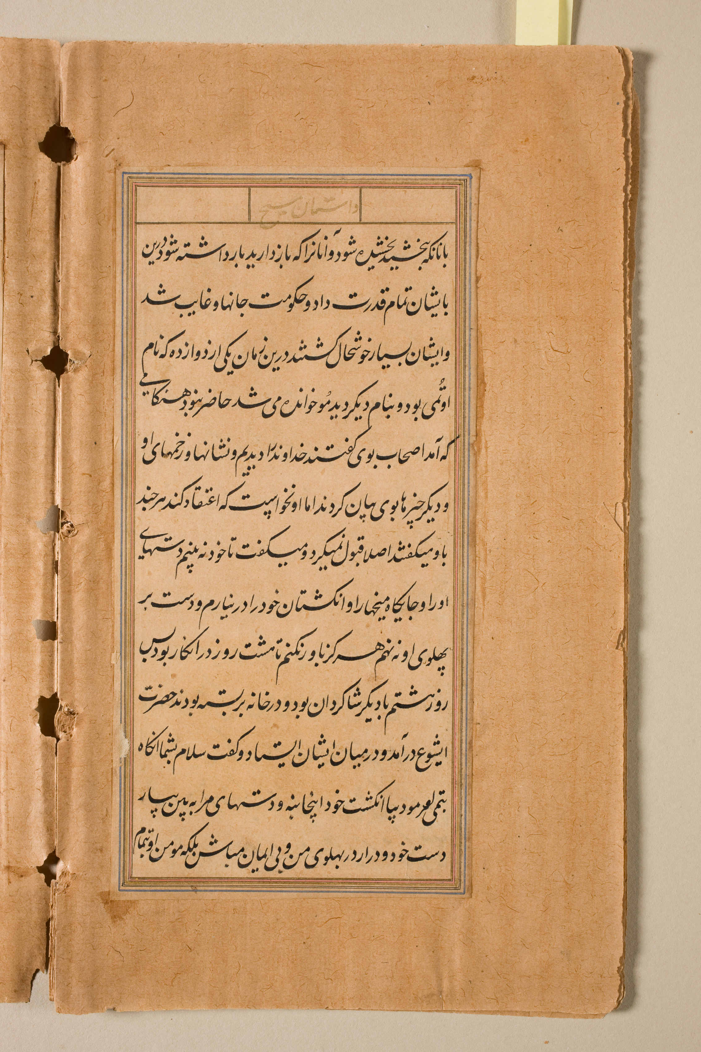 The image shows a page from a book with browned, aged paper. The page is rectangular and has a darker brown border around the edges. There are three holes punched along the left side of the page, and the edges are rough and torn in some places. In the center of the page, there is a rectangular text box outlined in blue and gold. The text within the box is written in black ink and appears to be in a foreign language, possibly Arabic or Persian. The text is written in a flowing script and is densely packed within the text box. The background of the image is a plain beige color, suggesting that the page is being displayed against a neutral backdrop. A small piece of yellow paper is visible at the top of the image, possibly a bookmark or a note.