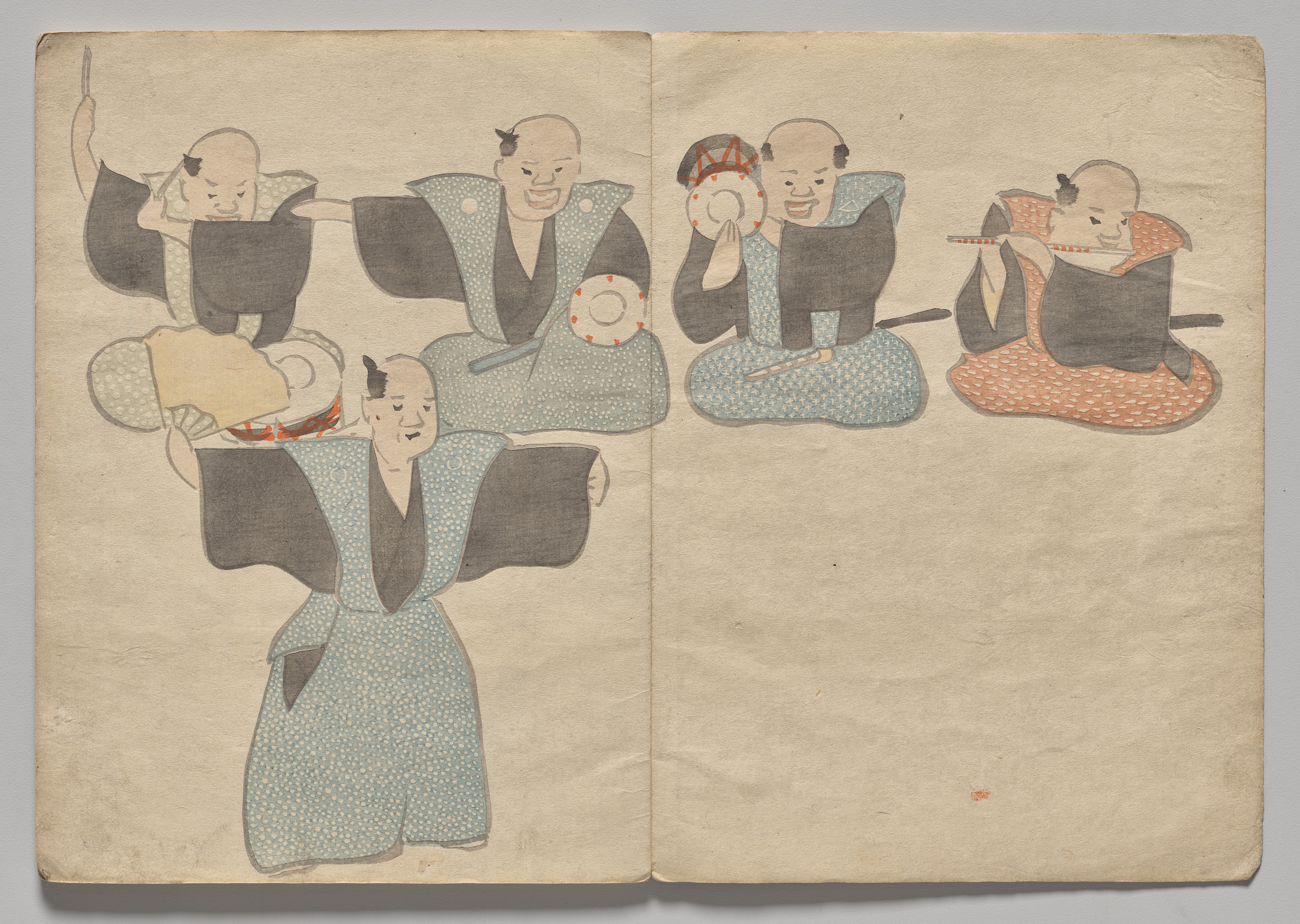 Two-page spread from an illustrated book. Six bald men in traditional Japanese clothing. Three on the left side, three on the right. The men on the left wear black tops and blue bottoms with white dots. They hold circular objects with red dots. The men on the right two also wear black tops. The one on the far right sits on an orange and white patterned cloth, while the one next to him sits on a blue and white patterned cloth. The man on the left holds a stick. The background is beige. The pages are worn and aged.