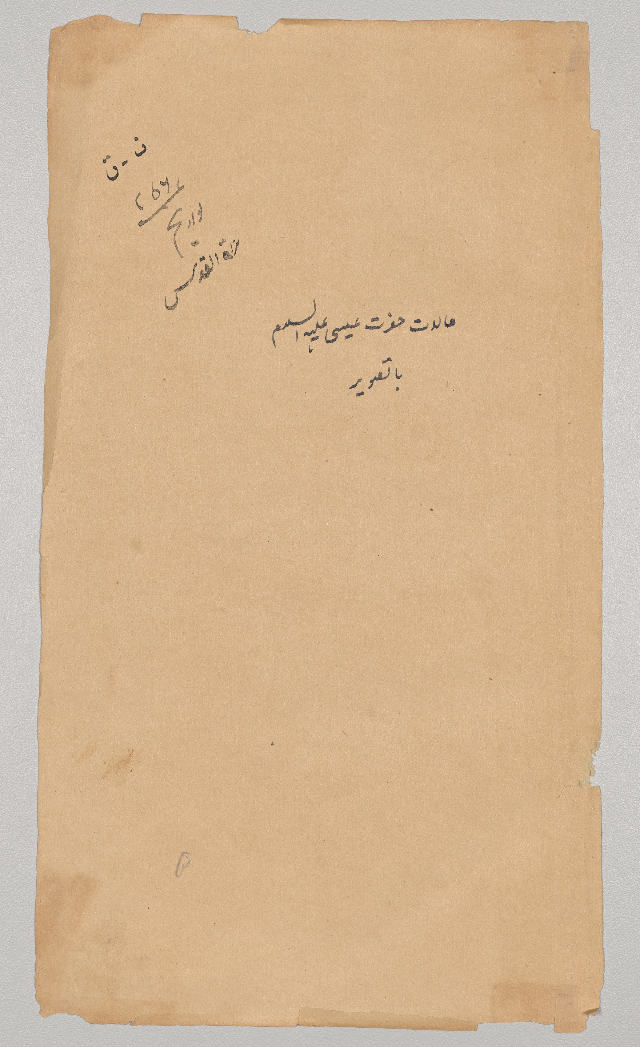 Brownish-yellow aged paper with rough and torn edges. The page has darker brown spots and a few stains. There are two sets of handwritten text in black ink. The top set consists of four lines written at an angle, and the bottom set consists of three lines written horizontally. The text is in a non-Latin script, likely Arabic. The background behind the paper is light gray.