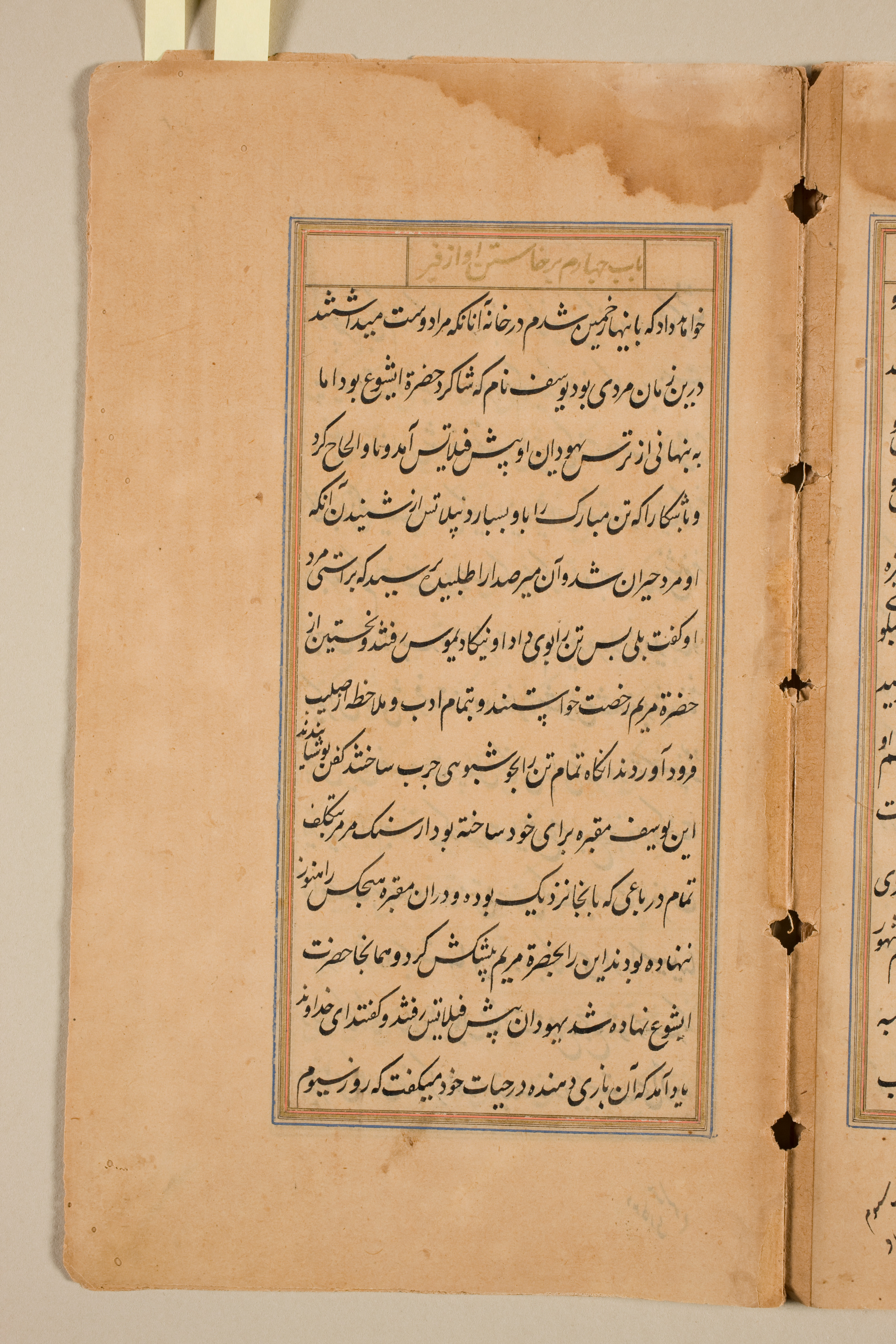 The image shows an open book with yellowed pages. The left page is fully visible, while the right page is partially visible. The pages have dark brown stains and holes along the spine. A blue border surrounds a block of black text in a foreign script, likely Arabic or Persian, within a rectangular area on the left page. A thin red line borders the inside of the blue border. A small section at the top of the block has a gold-colored background with black text. The book appears to be old and worn, with a beige background visible behind it.