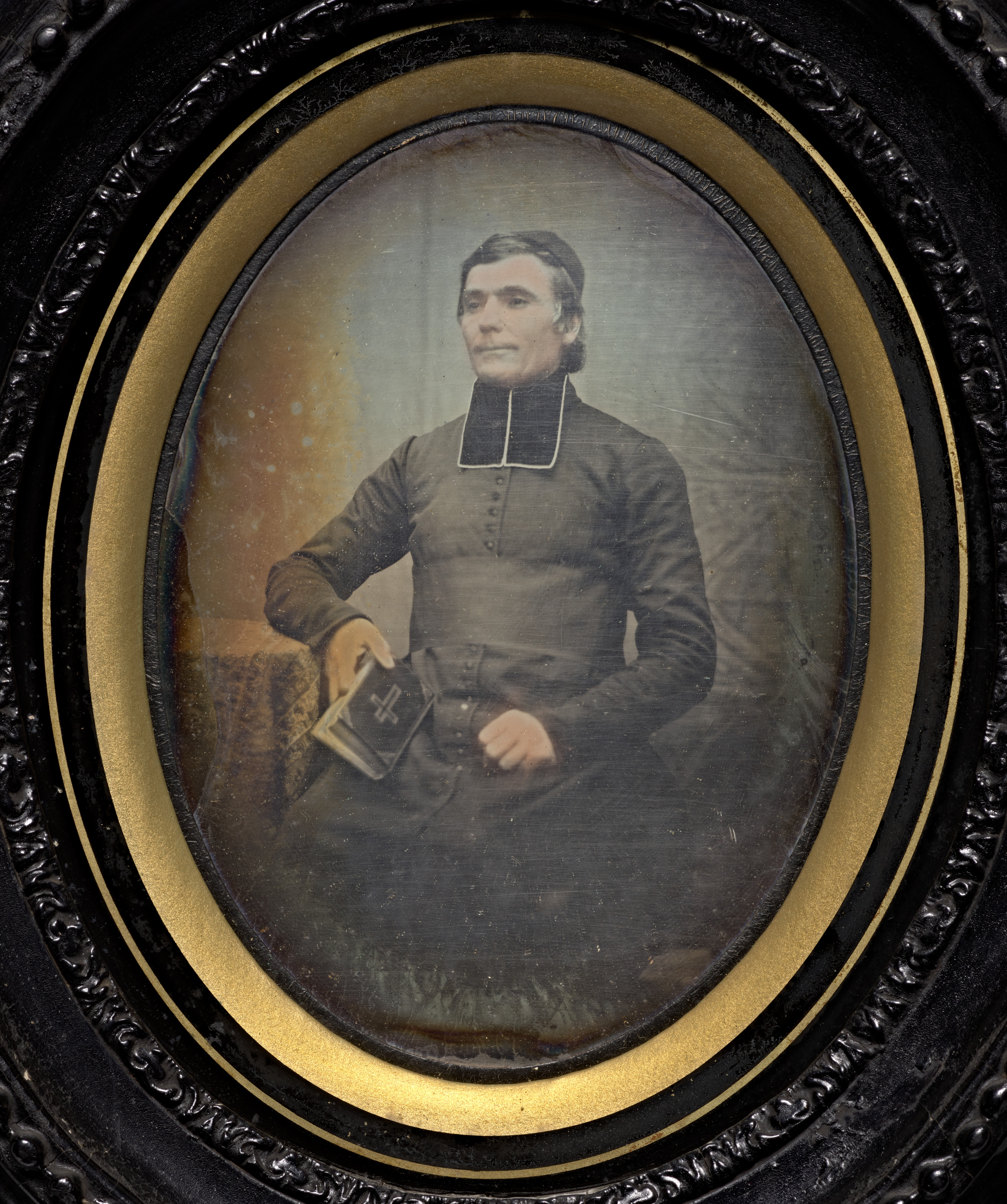 Oval-shaped portrait of a man in a religious outfit. The man has short dark hair and wears a dark-colored clerical shirt with a distinctive clerical collar. He holds a book in his right hand. The portrait has a black frame with a gold border around the portrait. The frame has an ornate design around the edge. The background of the portrait is a plain color. Title: Priest, France. Artist: France.