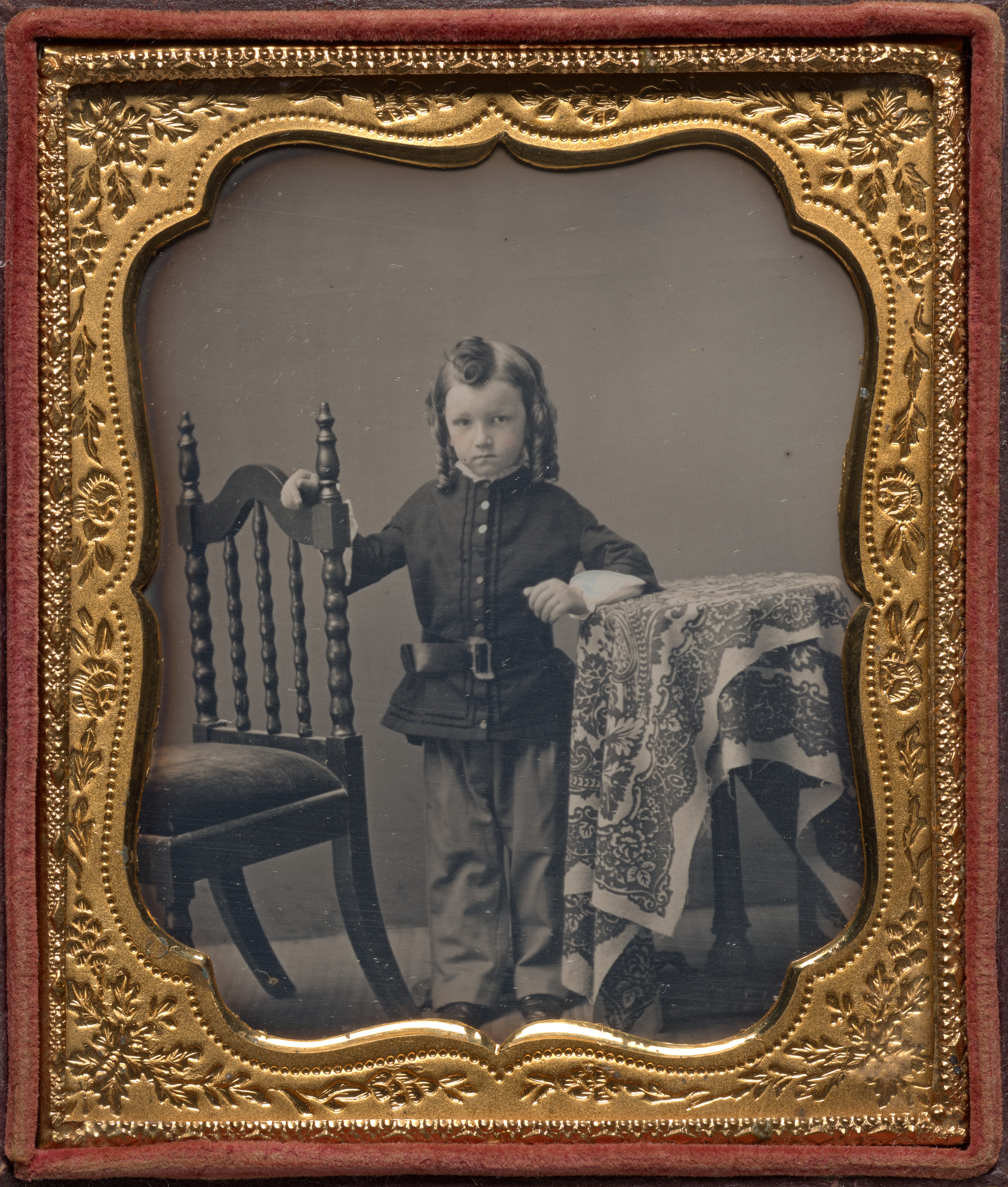 Gold-framed black and white photograph of a boy titled "Standing boy with bottle curls". The boy has fair skin and curled hair. He wears a shirt with a belt and buttons down the front, and pants. The boy stands with one hand on a chair and one on a table covered with a patterned cloth. The frame has a red velvet border. The ornate gold frame has curved scalloped edges and etched floral designs. The background behind the boy is plain.