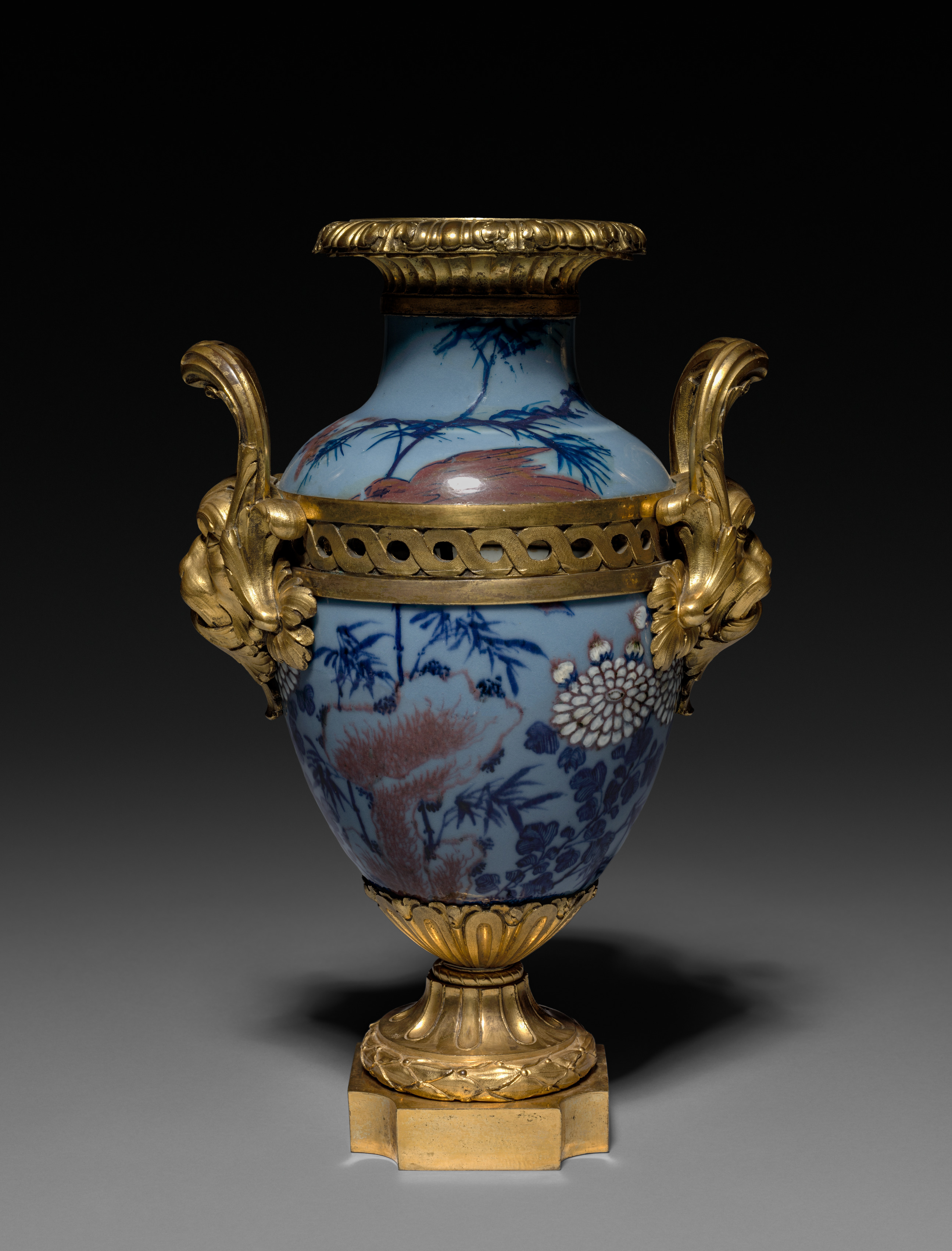 Vase for a Garniture Set by Royal Worcester. The vase is predominantly light blue with a wide mouth and a fluted rim. It has a wide body that tapers towards the base. The vase features two handles on either side that are adorned with gold-colored metalwork. The handles are shaped like curved leaves or branches. There is gold-colored metalwork around the middle and base of the vase. The base of the vase is square. The vase has a floral design in shades of blue, pink, and white. The background of the image is dark gray to black, with the vase casting a shadow.