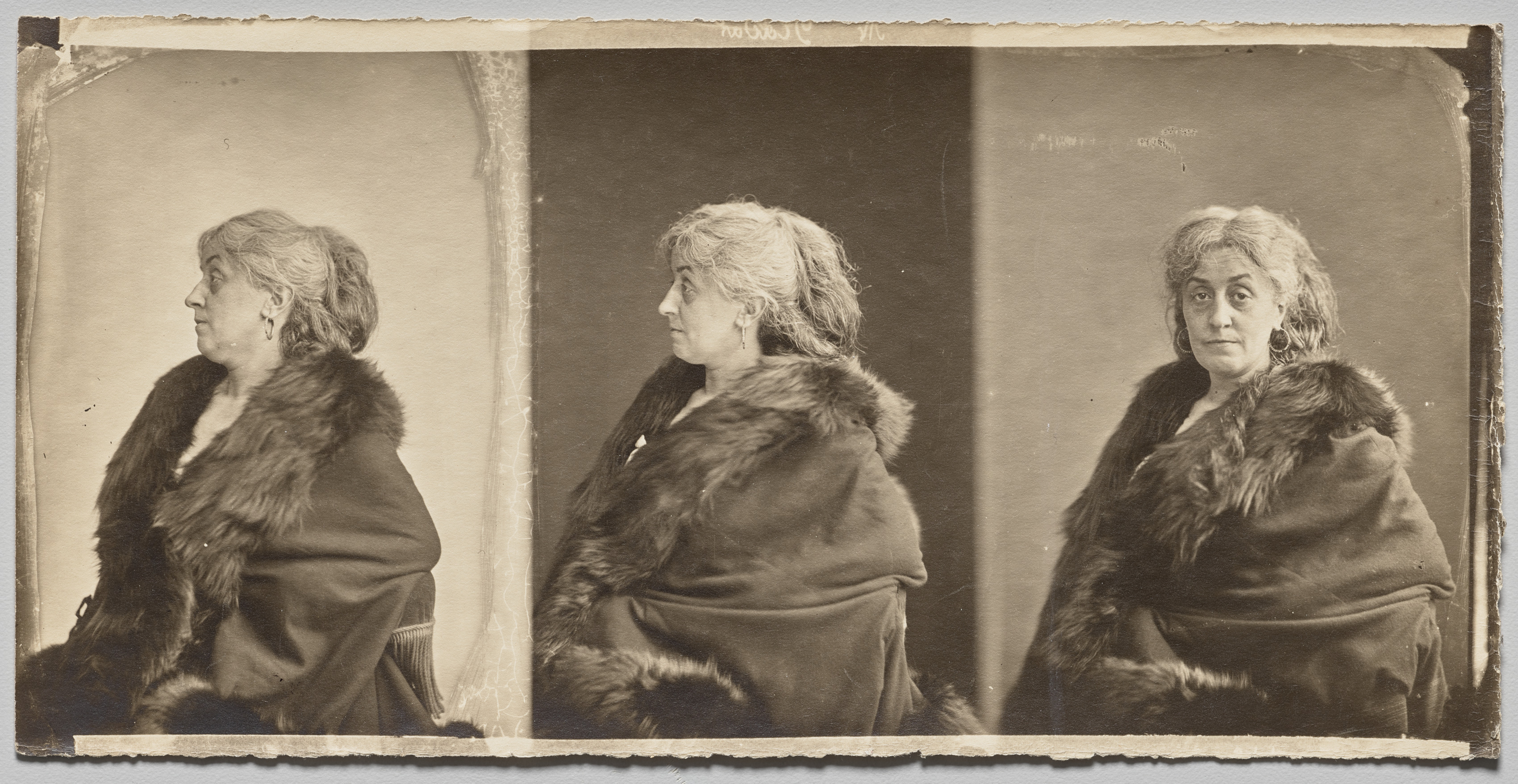 Black and white photograph of a woman with short hair, wearing a dark fur-trimmed shawl or coat. The image is divided into three panels, each showing the woman from a slightly different angle. In the first panel, she faces left. In the second panel, she faces left and slightly forward. In the third panel, she faces forward, looking directly at the camera. The woman wears earrings and has her hair styled back. The background of each panel is different. The edges of the photograph are torn and worn.