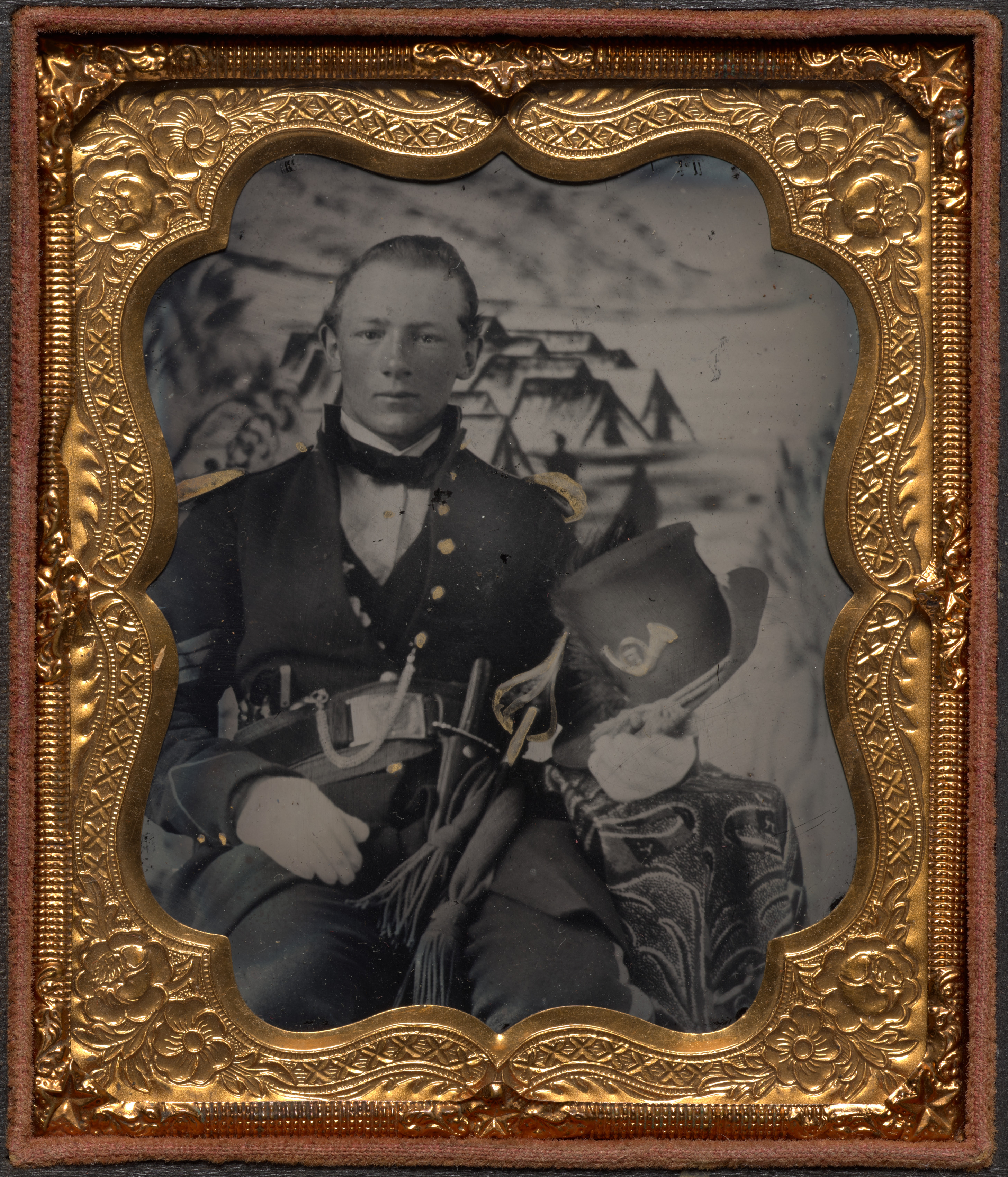 Black and white photograph of a man in a Civil War-era military uniform, a painted backdrop behind him, seated with a child on his lap. The man wears a dark jacket with gold buttons and a bow tie, a belt and sheath at his waist. The child wears a dark hat. The photo is in an ornate gold frame with a scalloped edge and floral pattern. The frame has a red velvet border. The background of the photo appears to be a painted scene of a tent or other structure. The overall image is a Civil War-era tintype portrait.