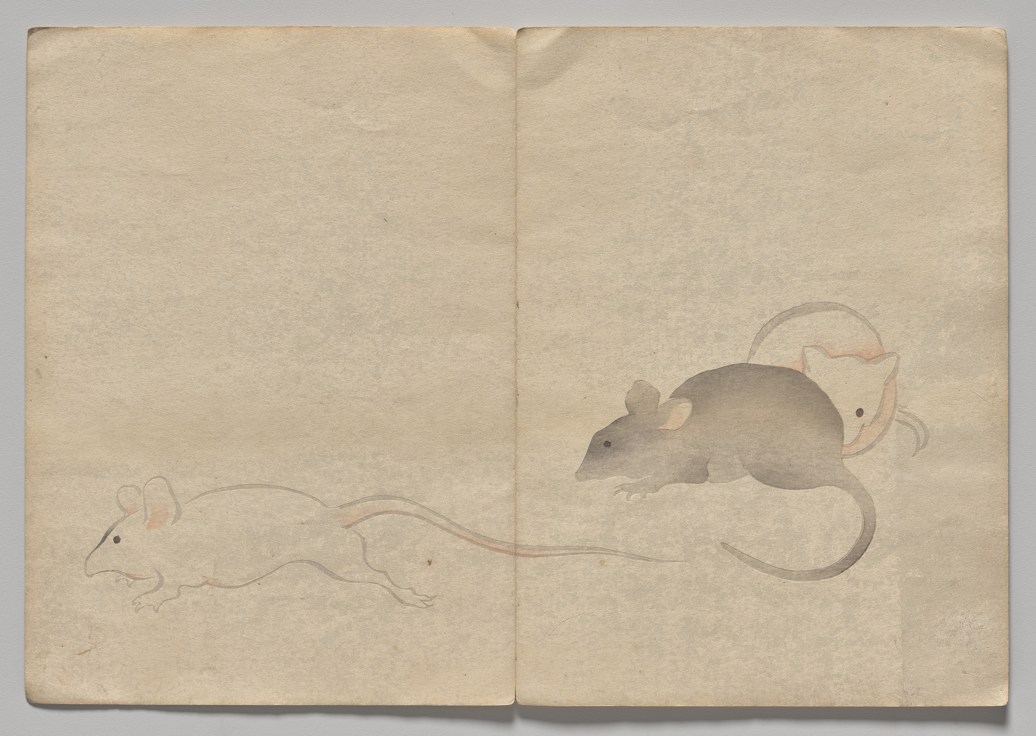 A book opened to two facing pages with beige paper. Two gray mice are drawn on the pages. The mouse on the right is fully colored and the mouse on the left is outlined. The mouse on the left faces left and the mouse on the right faces left. Both mice have pinkish inner ears, and the mouse on the right has a pinkish tail. The background of the pages is plain.