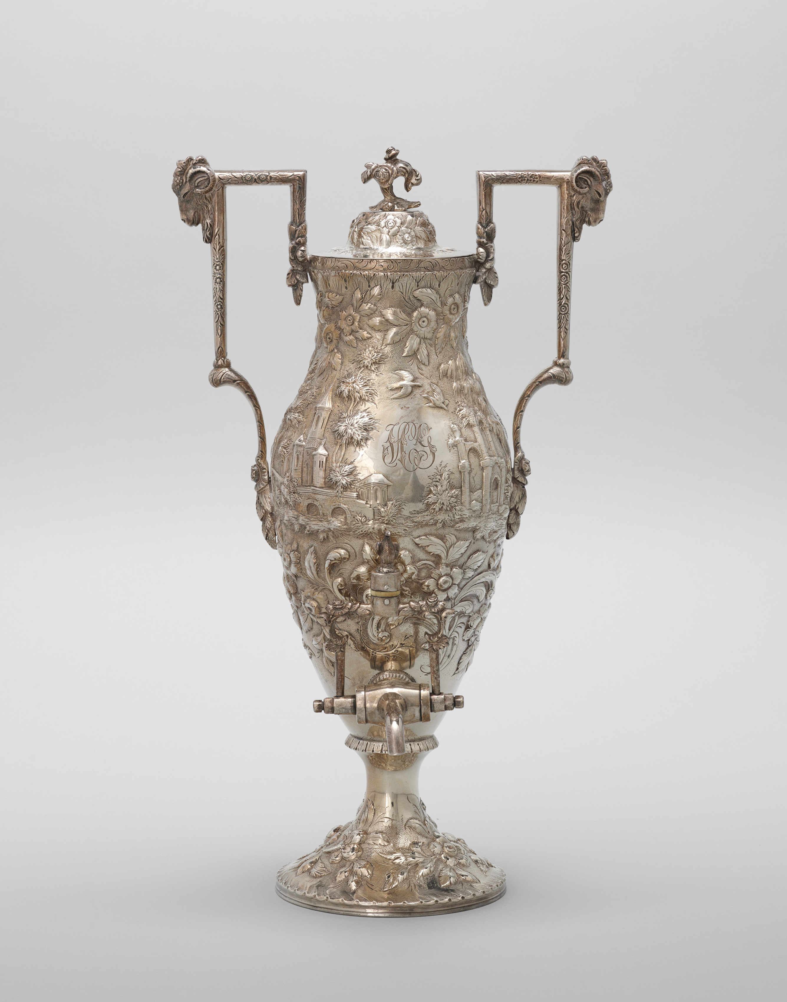 Coffee Urn by Samuel Kirk: A silver-colored urn with a lid and two handles on either side. The urn body features engravings of buildings and floral patterns. It has a base and stem with similar engravings. The handles have a leaf design and are attached to the urn with a decorative element. The urn features a spout on the bottom front. The background of the image is gray and white.