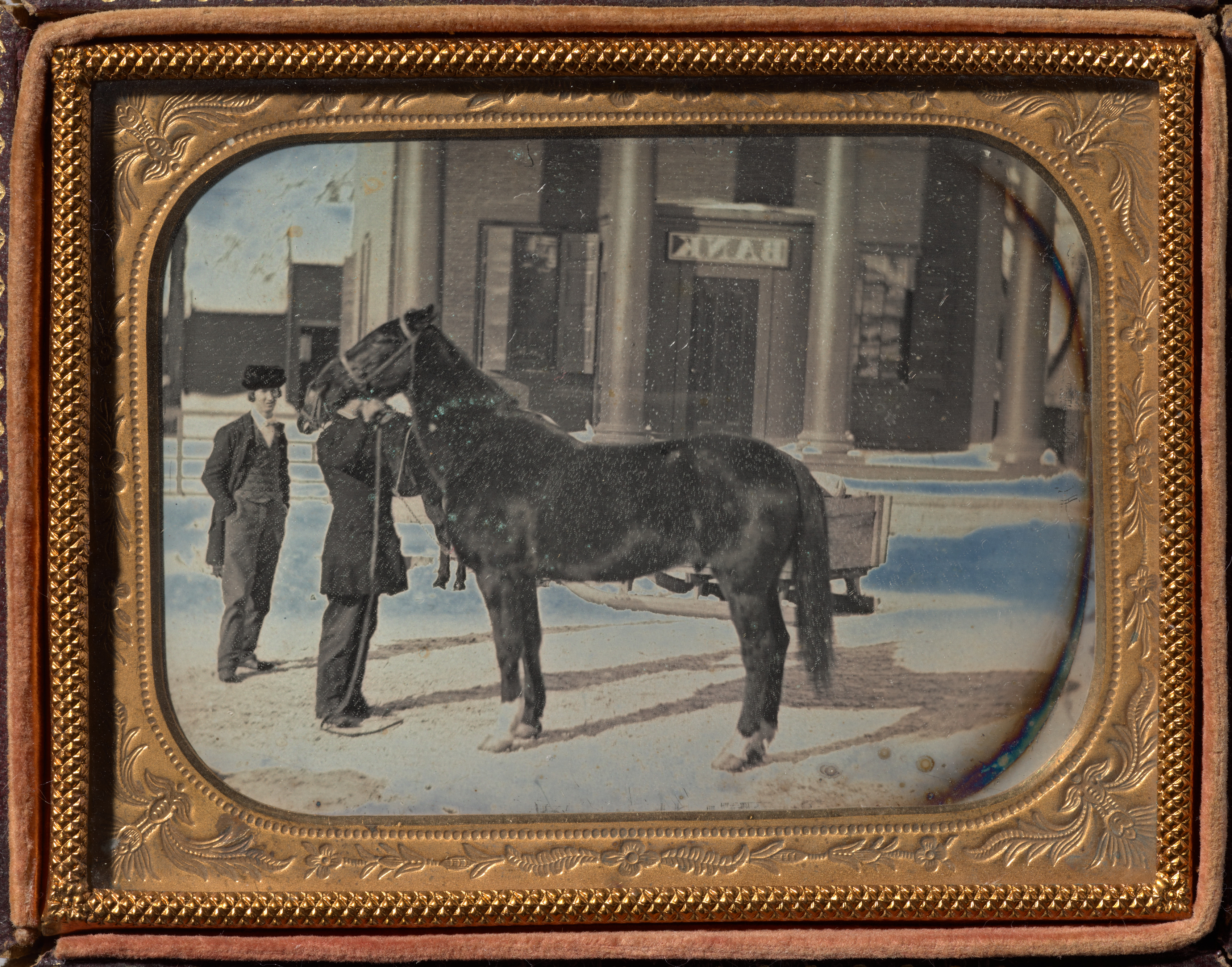A dark-colored horse with a white blaze on its forehead and white on three of its hooves stands on a street, facing left. A man wearing a dark coat and hat holds the horse by the bridle. Another man stands behind them, on the left. The background shows a building with columns and a sign that reads "DURAN." The scene is in a gold-framed, brown velvet case. The photograph has rounded corners and is set against a white background.