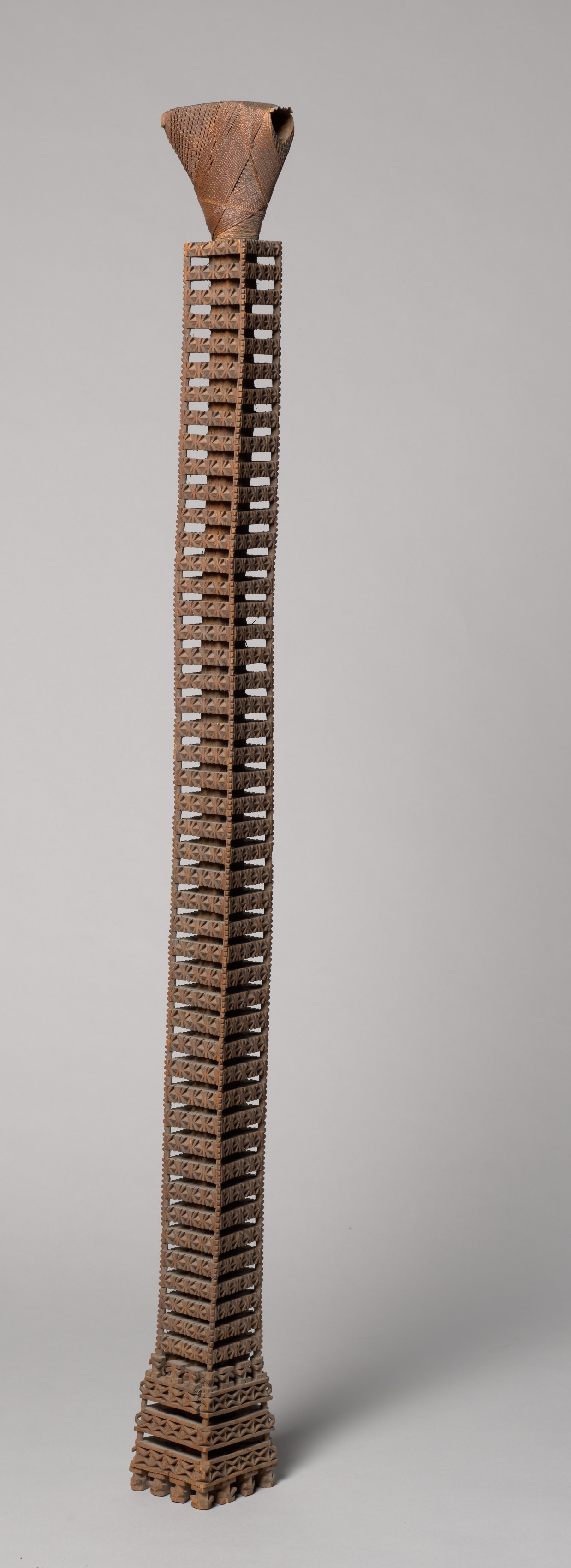 Brown wooden haft from a ceremonial adze, featuring a long, thin body with an intricate geometric pattern of squares on four sides. The body tapers from a wider base to a narrower top. A woven cord made of light-colored fibers wraps around the top. The top features a rounded conical shape with a slightly curved edge. The object casts a small shadow to the right.