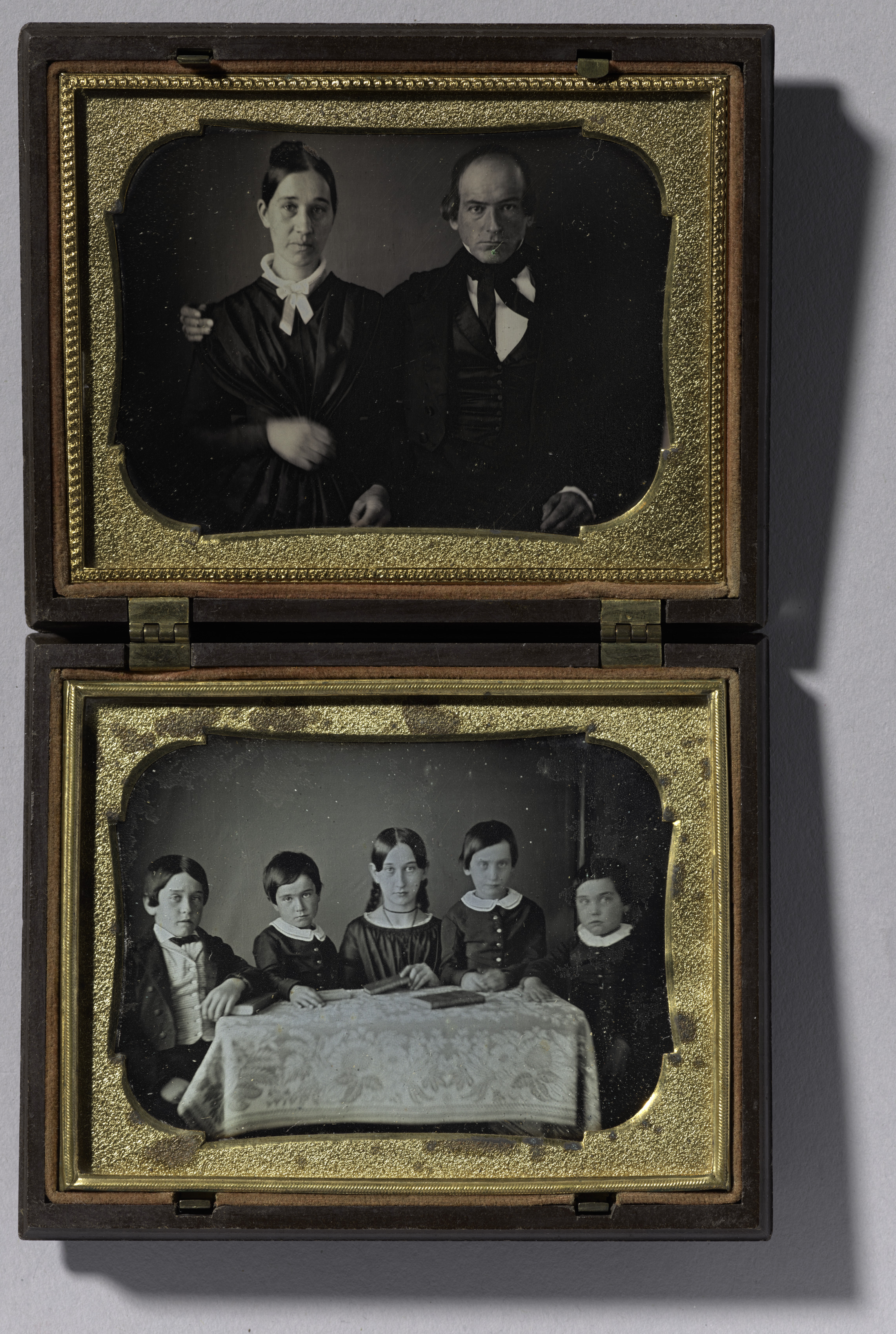 The image shows two black and white photographs in a hinged case. The top photo is of a man and woman. The woman is on the left and the man is on the right. The woman has dark hair pulled back and wears a dark dress with a white collar. Her left arm is bent at the elbow and her hand is in front of her waist. The man has dark hair parted on the side and combed back. He wears a dark suit with a vest and a bow tie. His left hand rests on his thigh. The bottom photo shows five children sitting behind a table covered with a white tablecloth. From left to right, there is a boy with a bow tie and jacket, two girls with pigtails and dresses, another girl with a dress, and a small child with a white collar. All the children wear dark clothing. Both photos have a gold border and are set into a dark wooden case with a hinged lid. The case is open, and the photos are displayed side by side.
