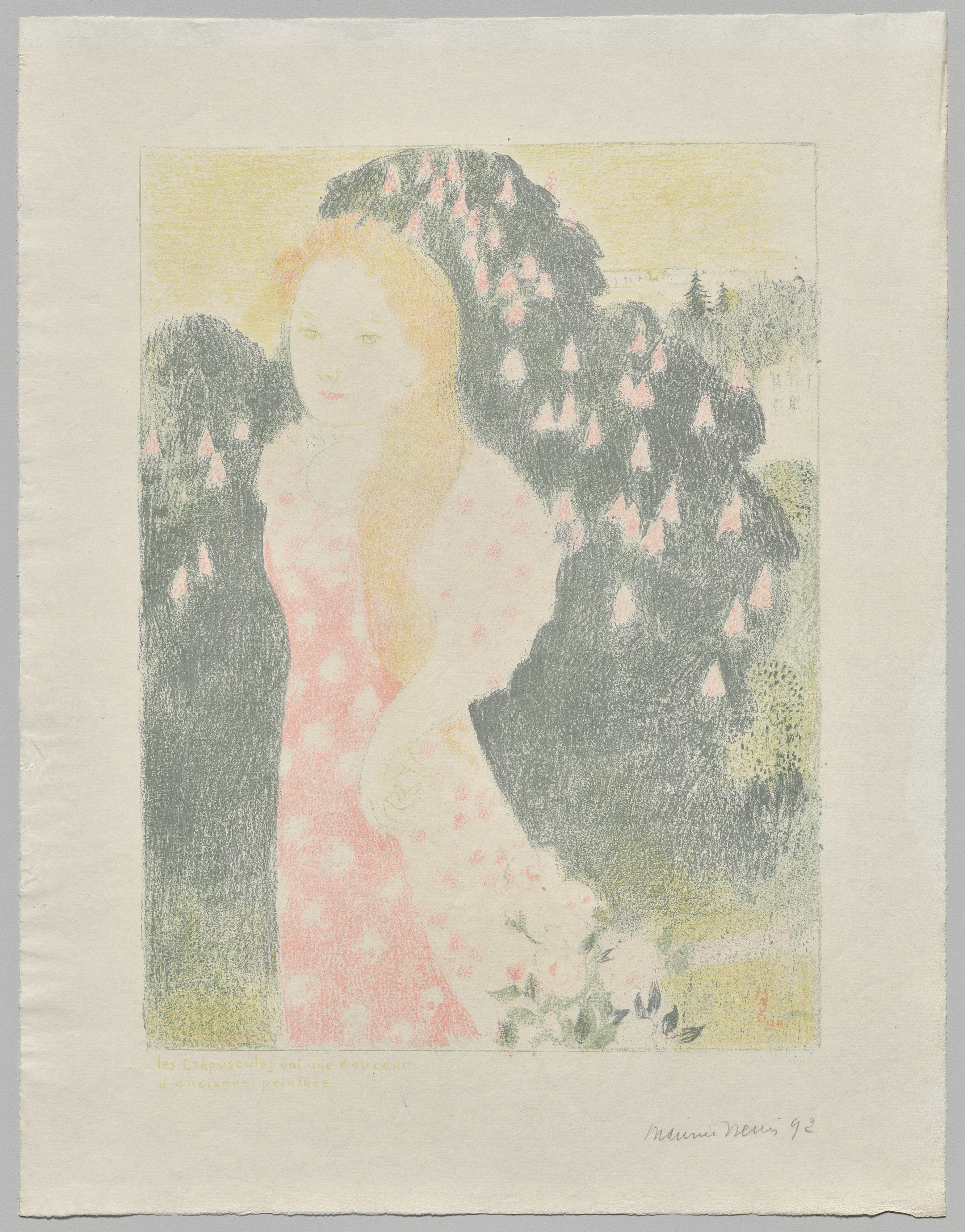 A woman with yellow skin and blonde hair wearing a pink dress with white polka dots. There is a tree behind her with pink flowers. The background is yellow. The woman's left arm bends in front of her. The woman's right arm is obscured. There are some flowers in her left hand. There are some handwritten words in cursive on the bottom-right. There are some handwritten words in print at the bottom-left. The paper form the print has a beige border around it. The paper is cream colored.
