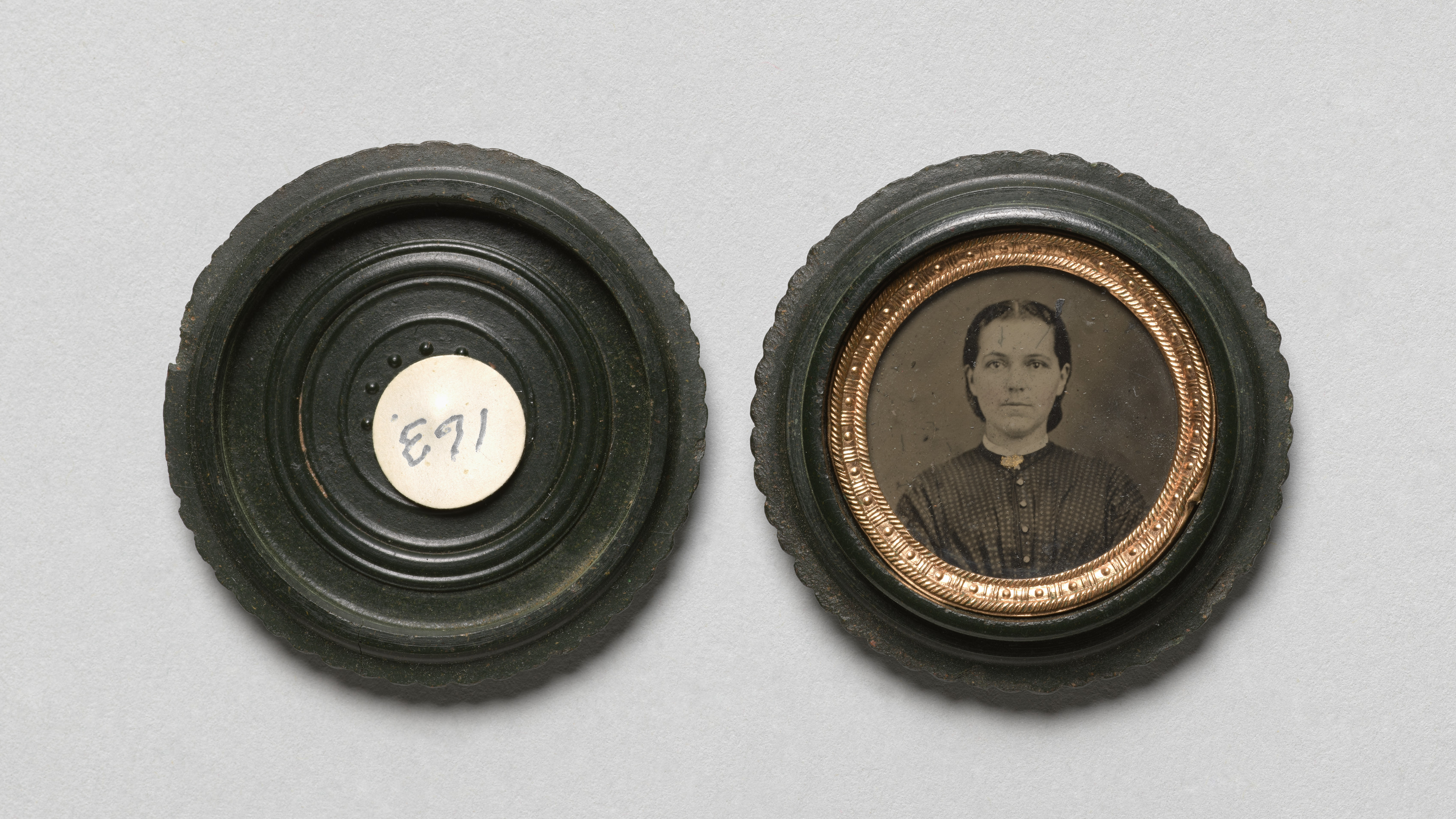 The image shows two round, dark green picture frames. The frame on the left is empty and has a white circular piece in the center with "E91" written on it in blue ink. The frame on the right contains a sepia-toned photograph of a young woman. She has dark hair pulled back from her face and wears a dark-colored dress with a high neckline. The frame has a gold rope-like border around the photo. Both frames have a ridged edge. The background of the image is light gray. Portrait of a Young Woman by an unknown artist.