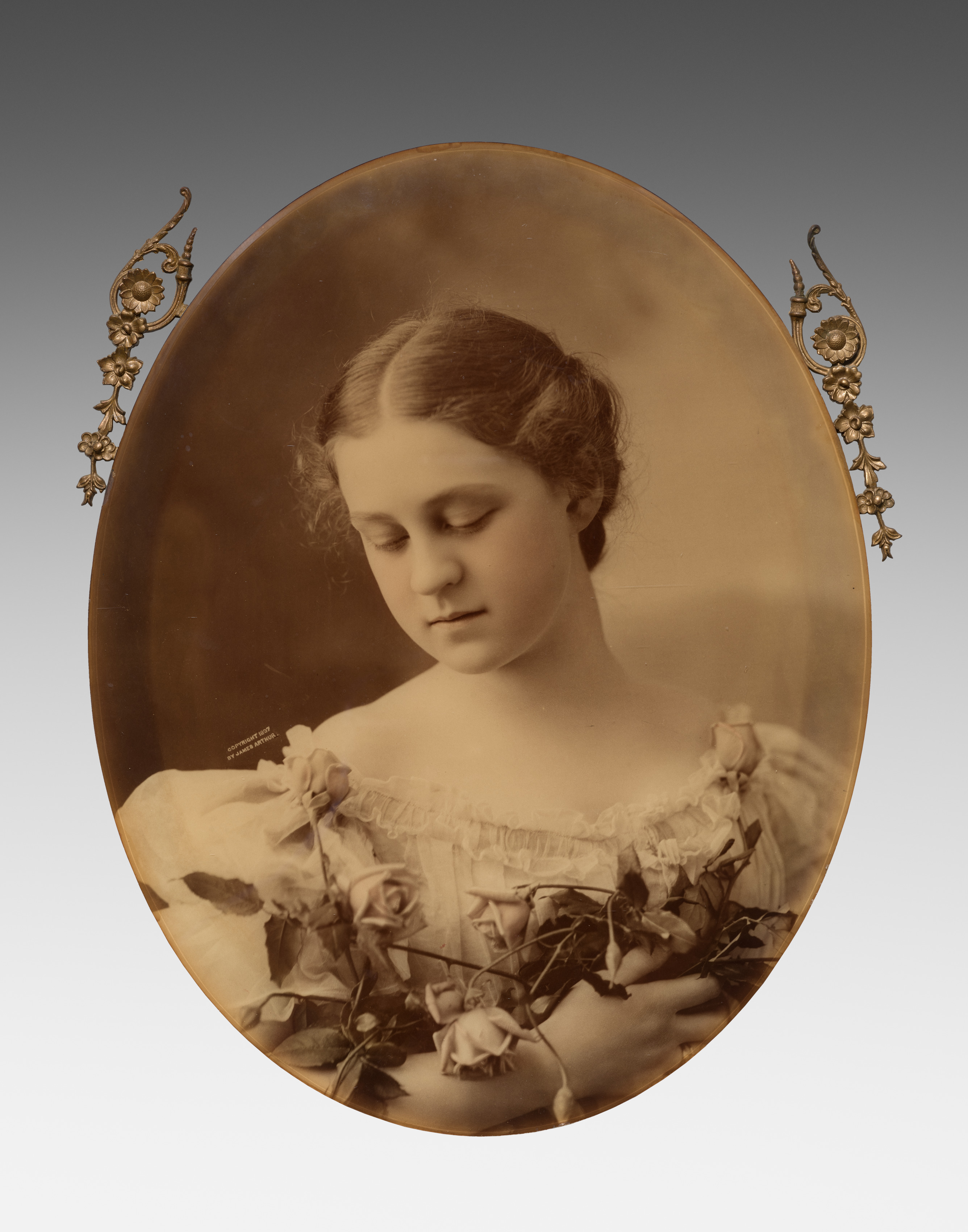 Oval-shaped photograph of a young woman with dark hair in a low bun, wearing a white dress with ruffles on the chest area and puffy sleeves. The woman is looking down and holding a bouquet of roses. She is surrounded by a thin gold frame with ornate gold designs on either side. The background of the photograph is a gradient from dark gray at the top to white at the bottom. Title: Young Woman Holding Roses by James Arthur.