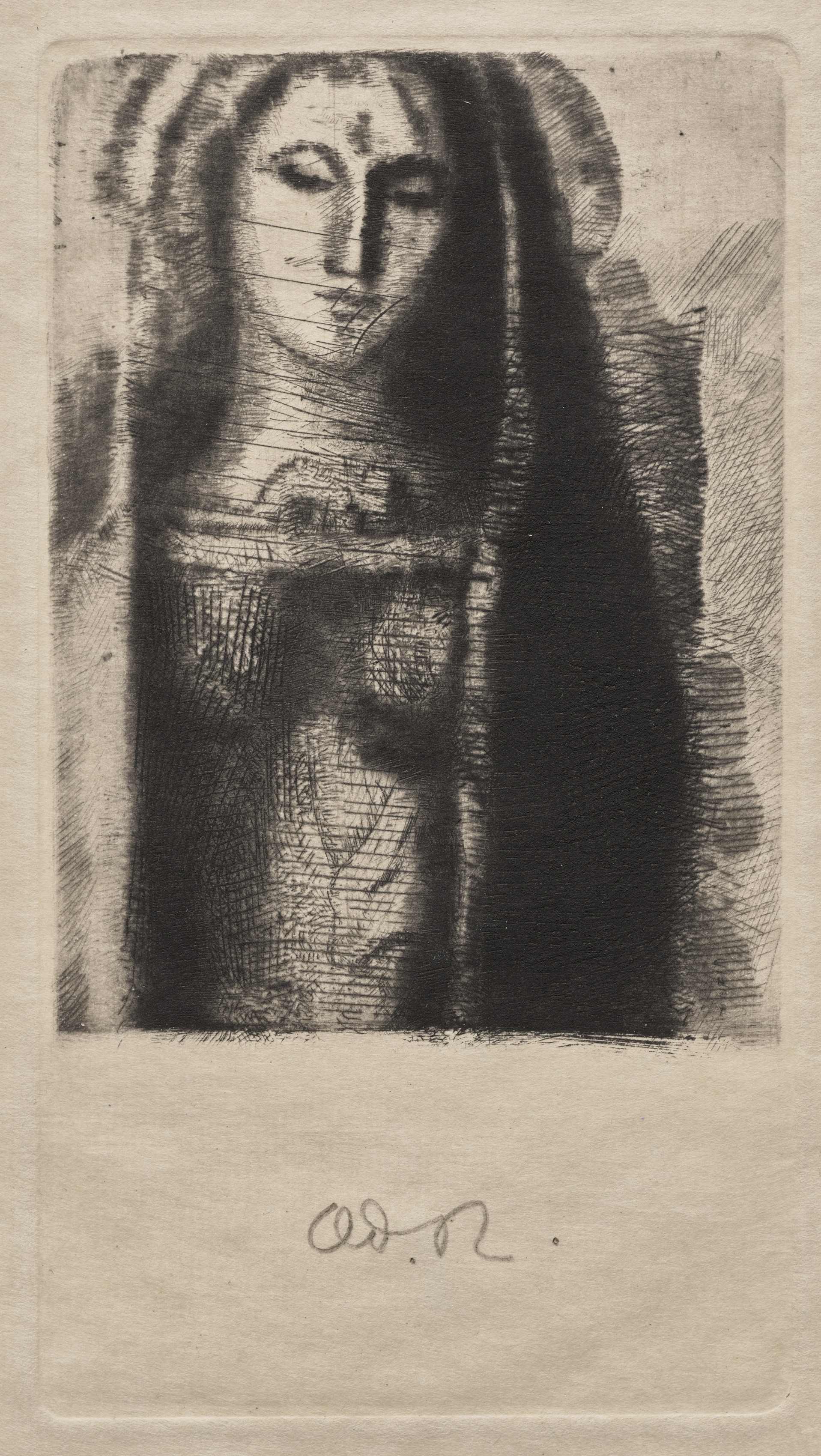 The image depicts a black and white drawing of a woman's head and torso. The woman has long hair and a neutral expression. Her eyes are cast downward. She wears a dark garment with a high neckline. The drawing is signed in the bottom center. The signature is illegible. The artwork is titled "Princess Maleine (The Little Madonna)" and is by Odilon Redon. The drawing style is charcoal or etching on paper, with visible lines and shading. The background is a light beige color. The overall mood is somber and contemplative.