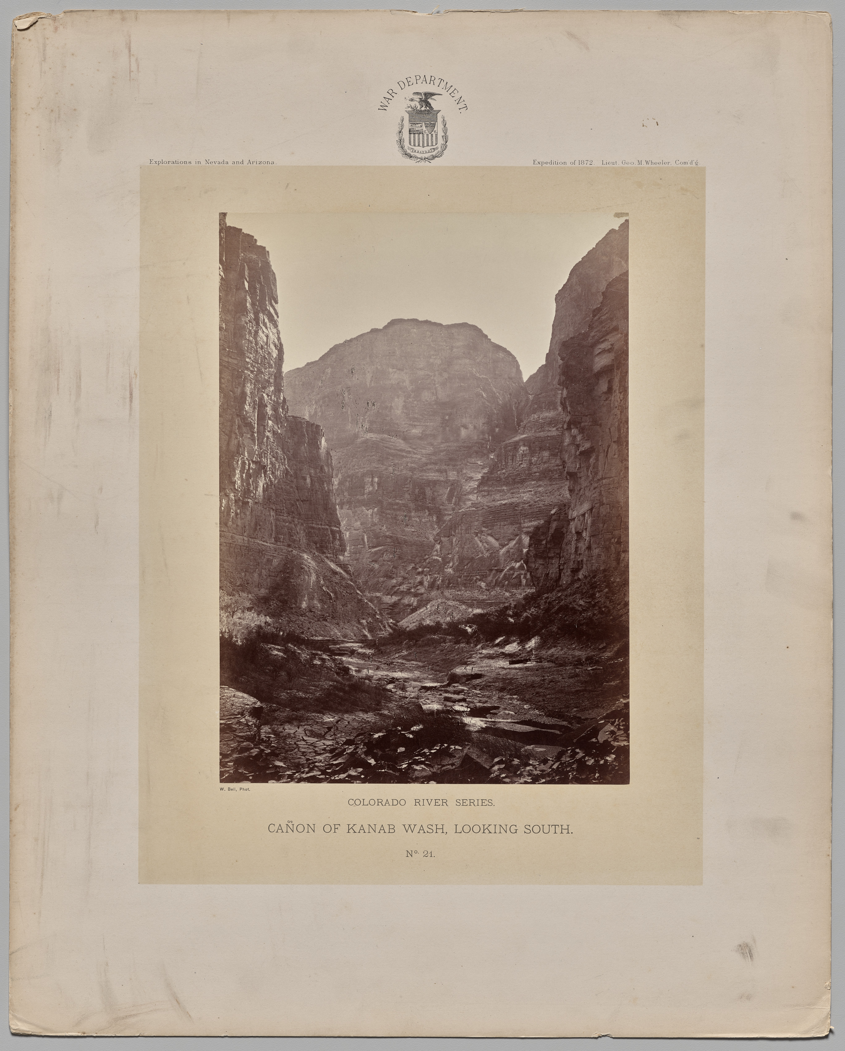 Sepia-toned photograph of a rocky canyon with steep cliffs on both sides. A stream runs through the bottom center. The photograph shows a view looking south. Large mountains are visible in the background. The photograph is mounted on a beige background, with a War Department emblem printed at the top. Text at the bottom of the photo reads "COLORADO RIVER SERIES. CAÑON OF KANAB WASH, LOOKING SOUTH. N° 21." The image is in shades of brown.