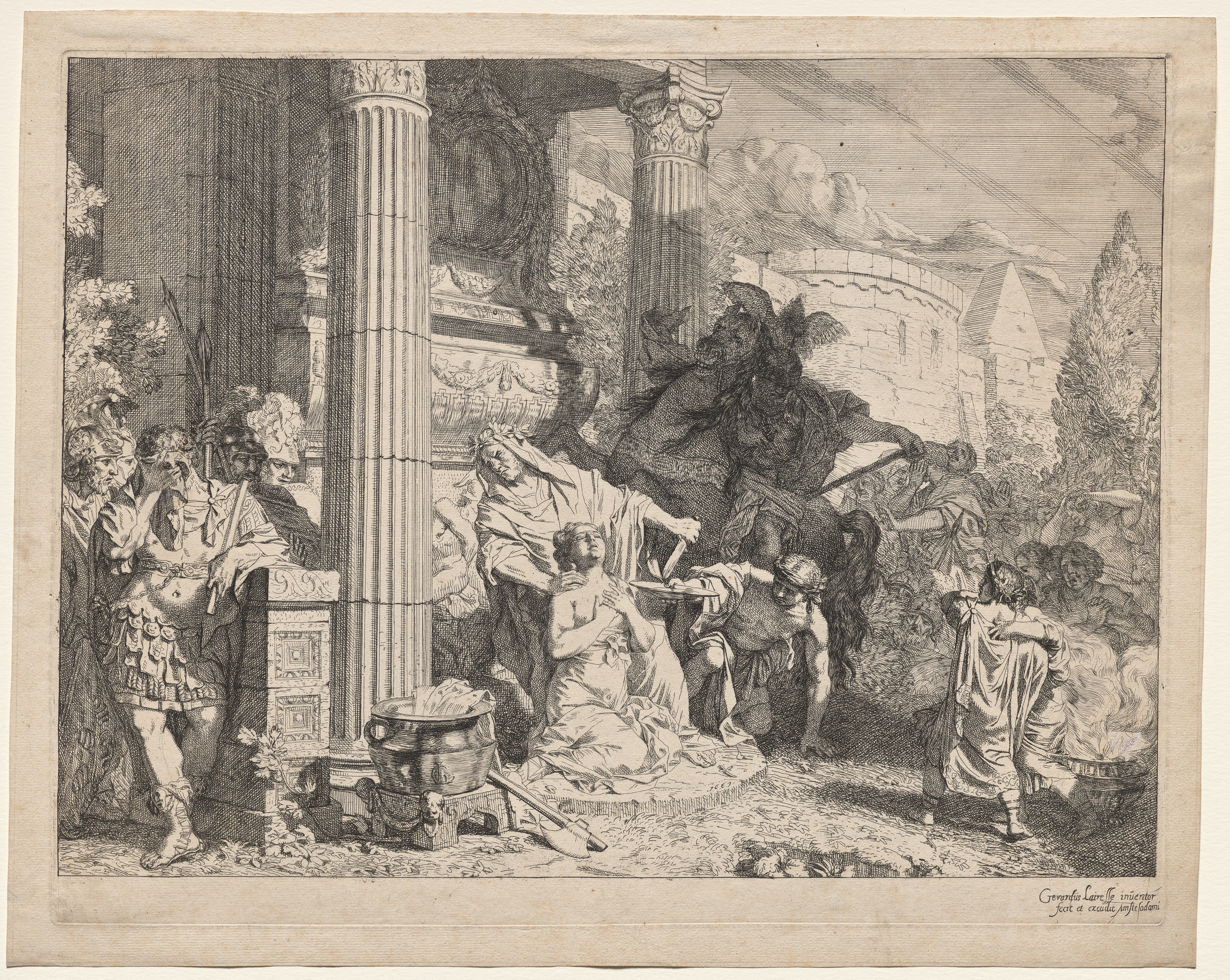 Black and white image of a scene with a woman in a white dress on her knees being held from behind by a man in a white robe while another man approaches her with a sword; man on left wearing a short tunic and leaning on column; distant mountain with fortified wall; two columns in the foreground; text in bottom right corner. The Sacrifice of Polyxena by Gerard de Lairesse.
