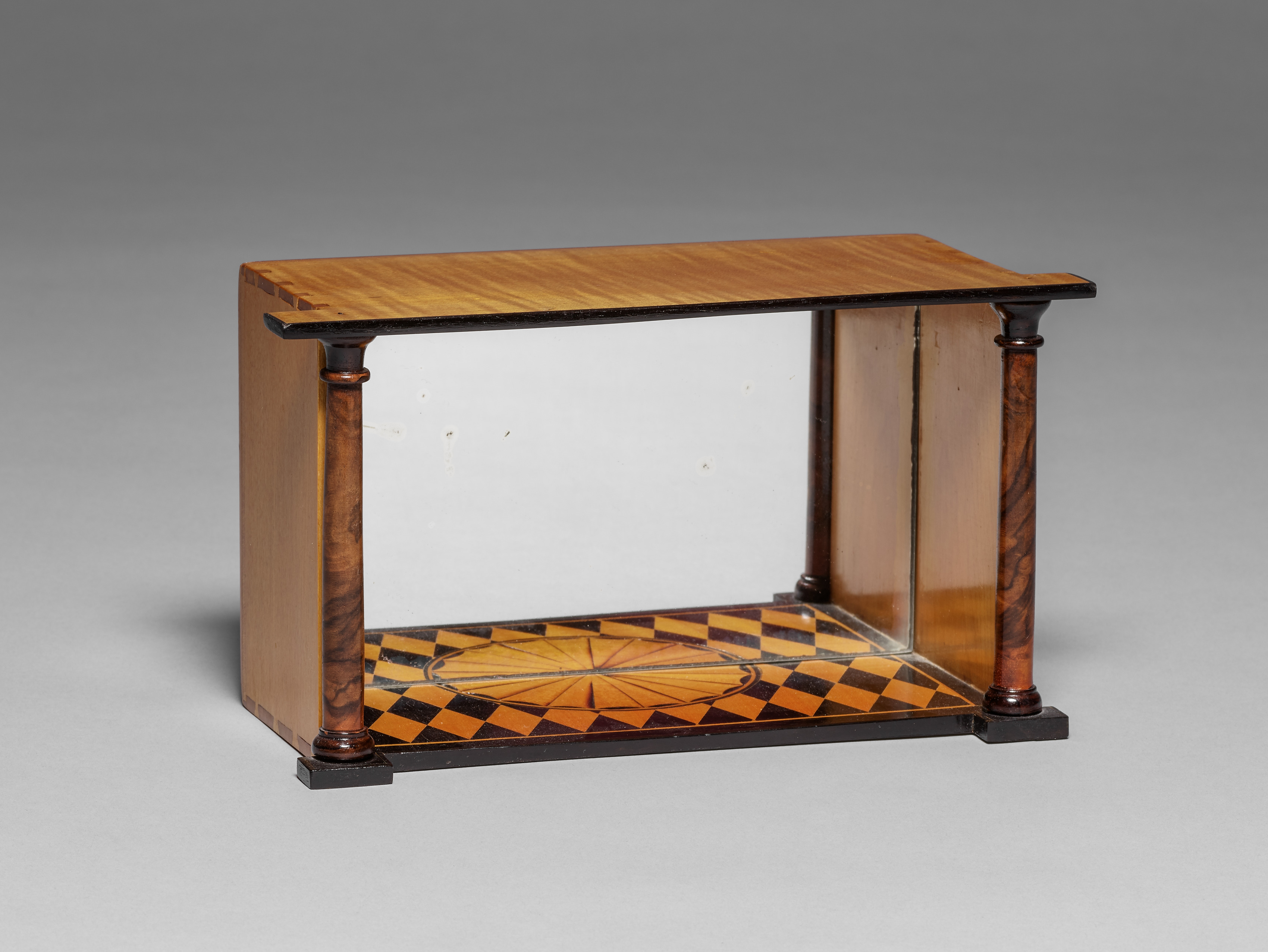 Mirrored Partition for a Globe Work Table (Globustisch) by Josef Hoffmann. Rectangular table frame with a flat top, made of wood. The top has a lighter wood tone with darker edges. Four legs, two on each long side, are made of darker wood with a marbled pattern and have simple molding at the top and bottom. The legs are attached to small black feet. The open sides have no backing; one side is flat and reflects light like a mirror. The base has a black and orange checkerboard pattern with a circle in the center. The background is plain gray.