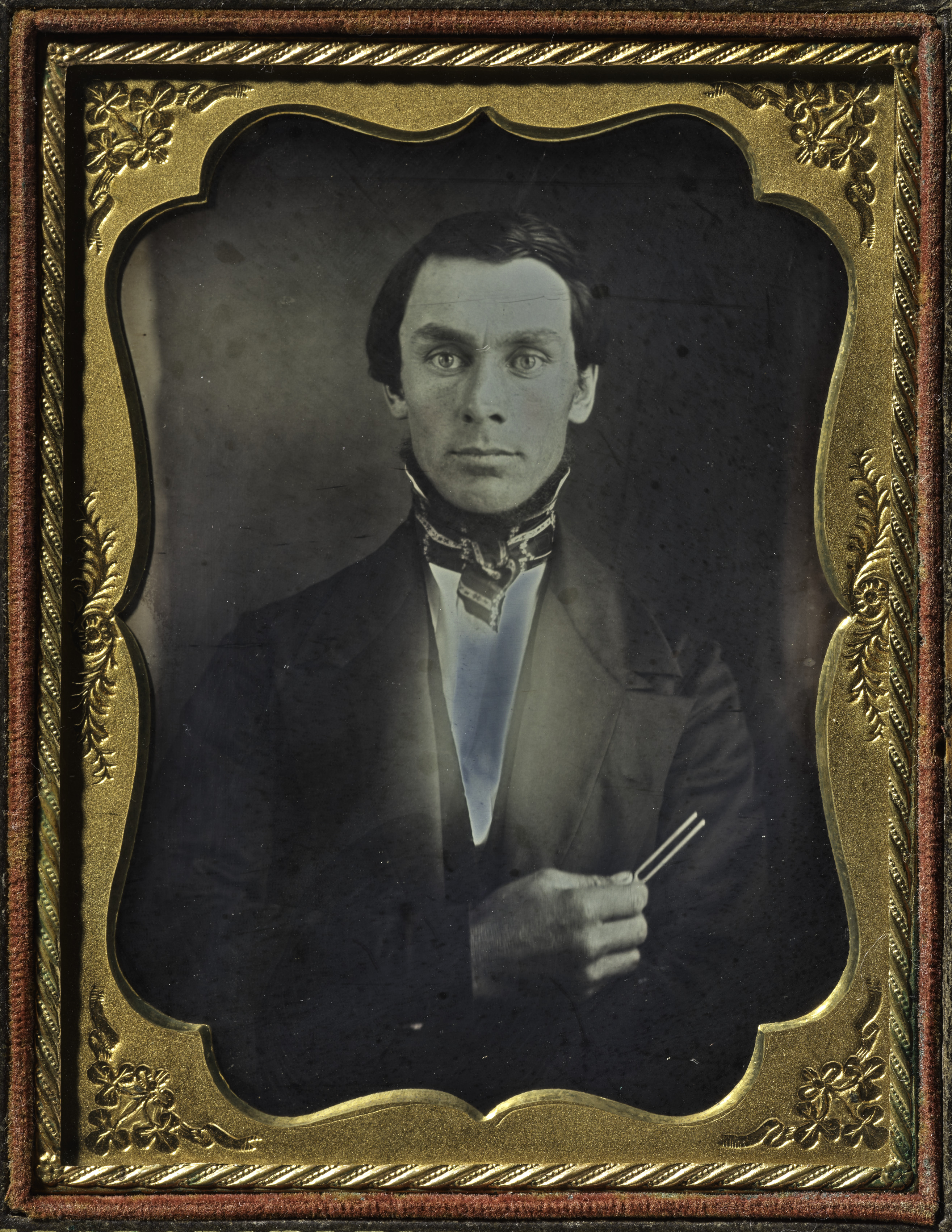 The image shows a framed daguerreotype of The Music Teacher. The man has dark hair parted on the side and combed to the right. He wears a dark jacket with a vest and a white shirt; a decorative neckpiece encircles his neck. The man holds two sticks, likely drumsticks, in his right hand. The image is in a gold frame with a wavy edge and ornate corners; it has a red velvet border. The frame has a raised rope design around the edge. The image is in black and white. The man stares at the camera.