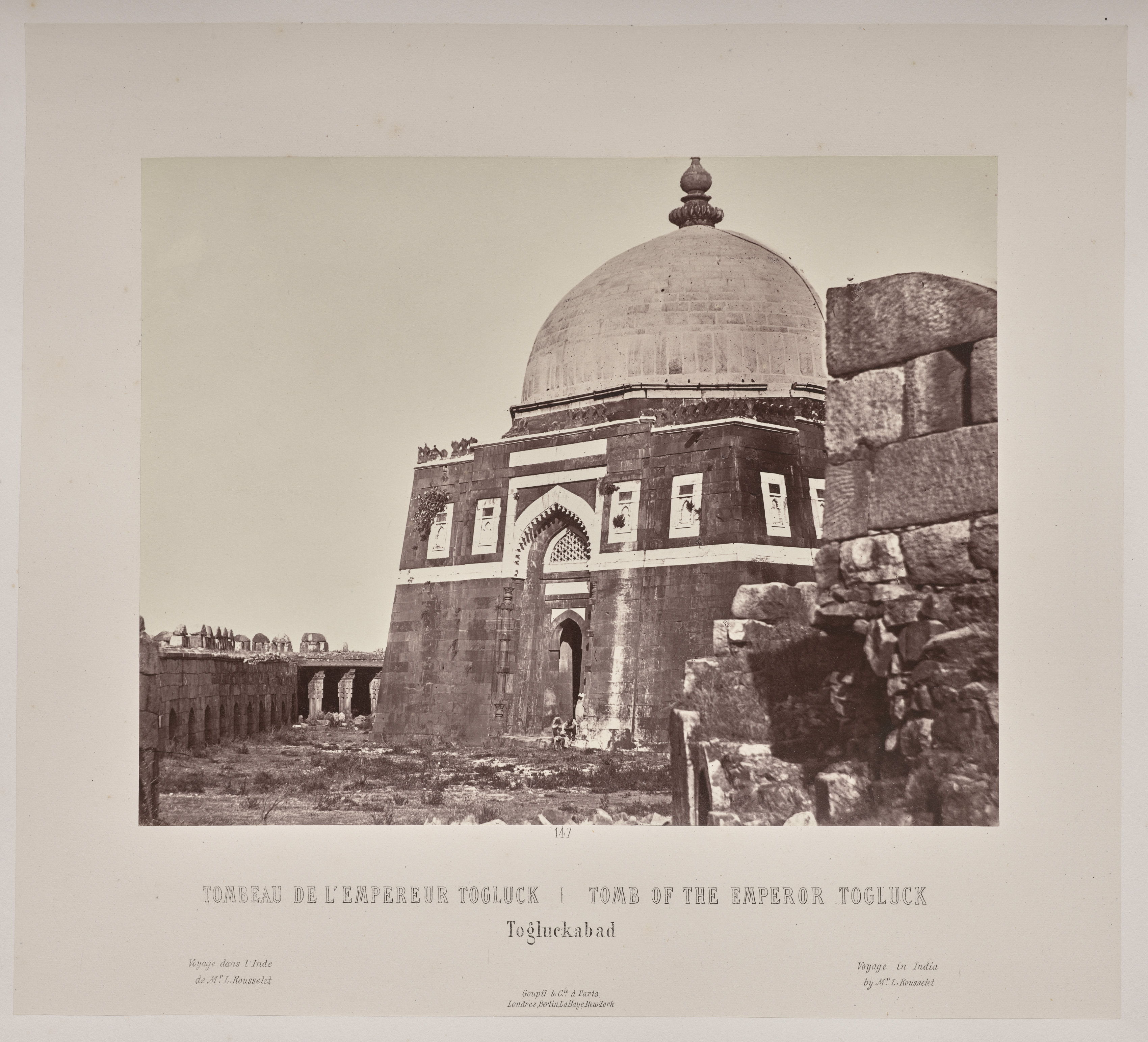The image shows a sepia-toned photograph of a large stone building with a large dome on top. The building is made of dark-colored stone blocks and has a large arched entranceway. There are several windows on the front of the building. A wall surrounds the building. The dome is made of lighter-colored stone and has a small decorative finial on top. The building appears to be old and worn, with some crumbling stones visible. The background of the photo is a plain sky. The image has text at the bottom that reads "TOMB OF THE EMPEROR TOGLUCK" and "Togluckabad".