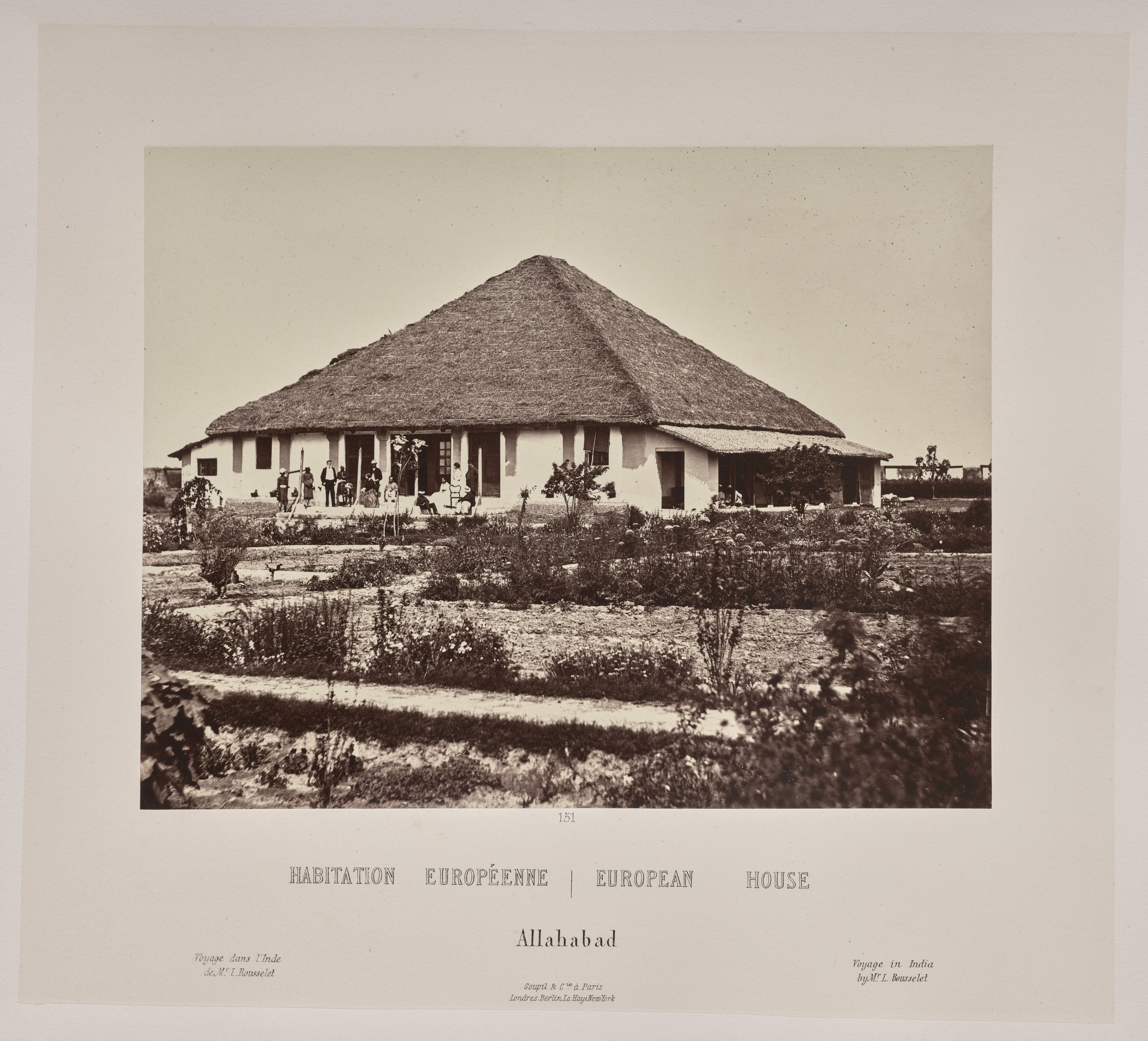 The image shows a black-and-white photograph of a large house with a thatched roof, surrounded by a garden. The house has a long, low profile with a wide, triangular thatched roof. It has a covered porch running along its front with several columns supporting the roof. People are standing or sitting on the porch. The house is white with several windows and doors visible. In front of the house is a garden with various plants and trees. The sky above the house is clear. The image includes text at the bottom, which reads "HABITATION EUROPÉENNE | EUROPEAN HOUSE" in small letters, with "Allahabad" written below.