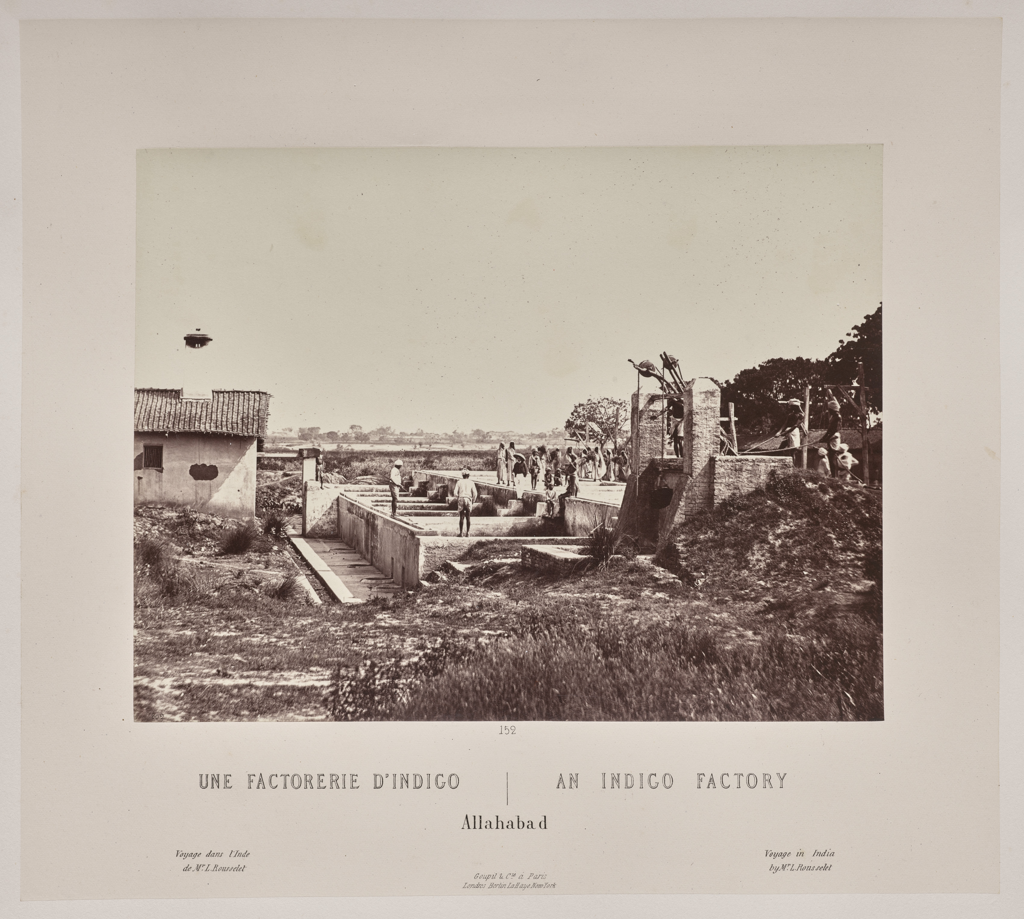Black and white photograph of an indigo factory. A large concrete basin in center with a small building to the left. A group of people standing on a walkway to the right of the basin. A brick structure on right. Trees and fields in background. Grass in foreground. Text at bottom of image reads "UNE FACTORERIE D'INDIGO | AN INDIGO FACTORY" on left and right, with "Allahabad" in center.
