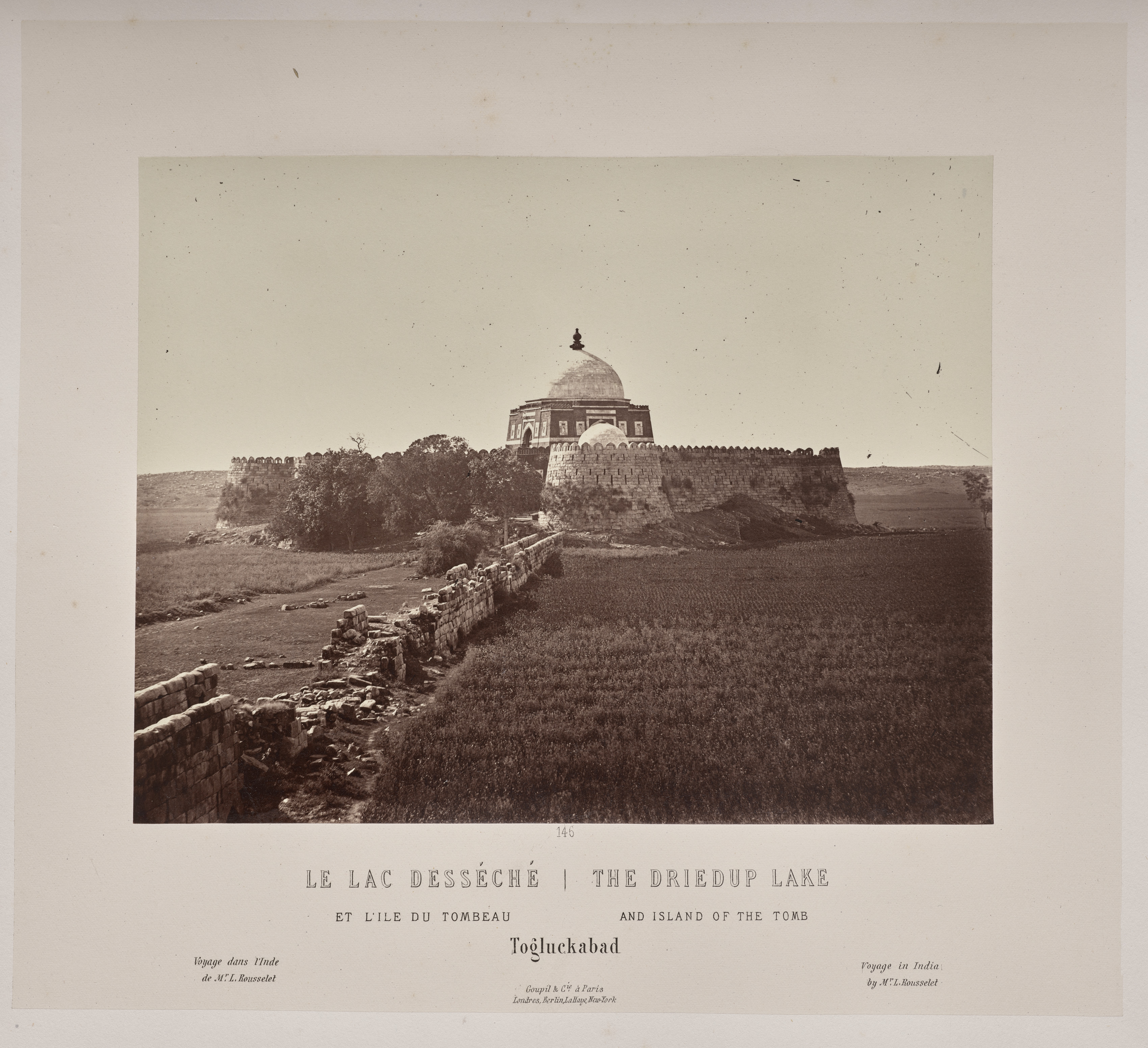 The image shows a sepia-toned photograph of a building on an island. The building has a large dome on top. It is surrounded by a stone wall. In front of the building, there is a field with short grass. To the left of the building, there are trees and another stone structure. The sky above is clear and light-colored. The photograph is mounted on a white background with text at the bottom. The text reads "LE LAC DESSÉCHÉ | THE DRIEDUP LAKE ET L'ILE DU TOMBEAU AND ISLAND OF THE TOMB" and "Togluckabad".
