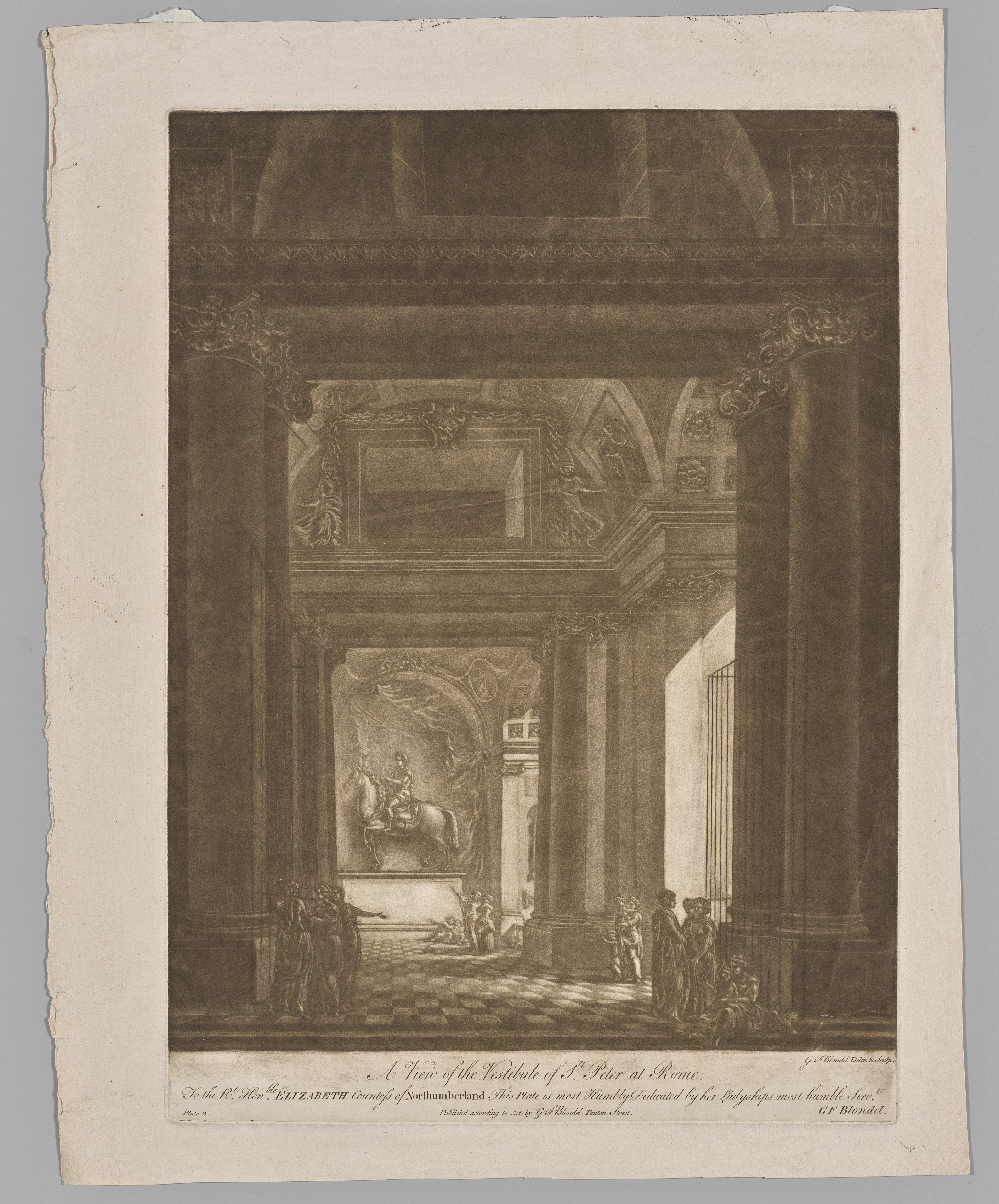 The image depicts a sepia-toned drawing of an interior view. The interior has a tiled floor with a checkered pattern. There are tall columns with intricate carvings on them. A group of people are standing on the right side, and one person is standing on the left. A statue on a horse is visible in the background. The ceiling features ornate designs and arches. The drawing is on aged paper with a torn edge. The title at the bottom reads "A View of the Vestibule of St. Peter at Rome".