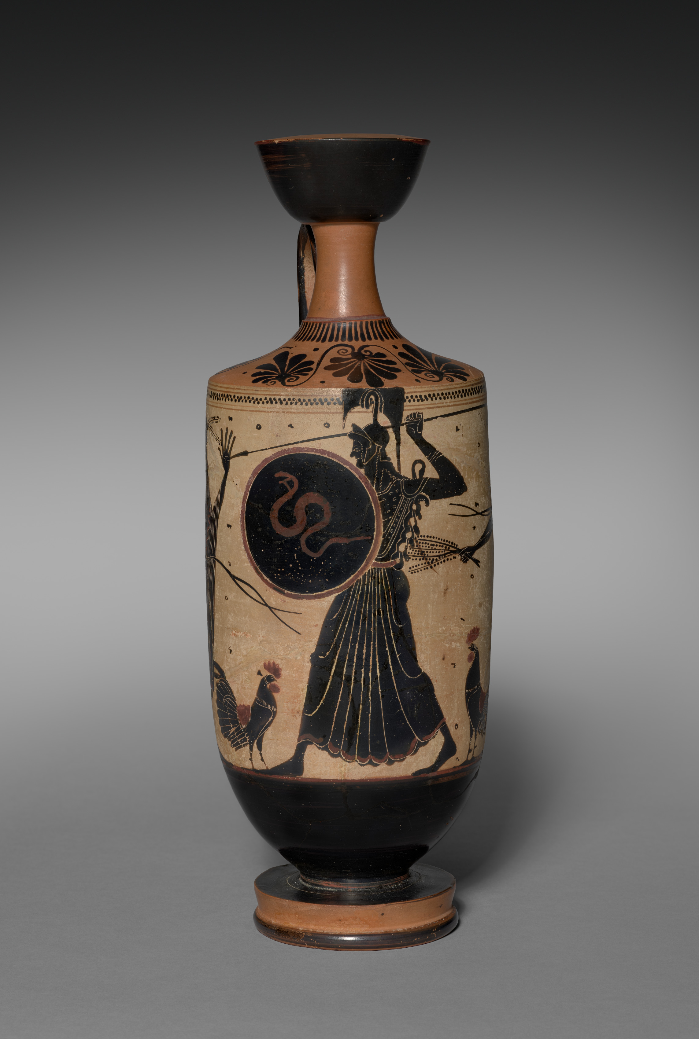 The vessel has a narrow base, a wide body that tapers in and out, a long thin neck, and a wide mouth. The body has a white background with black designs. A woman is drawn on the body wearing a long black dress and a helmet; she holds a spear and a shield with a snake on it. Two roosters are drawn on either side of the woman. The base and mouth of the vessel are black, and the neck has black floral patterns. The vessel has a small foot at the bottom. The background of the image the object is set against is gray.