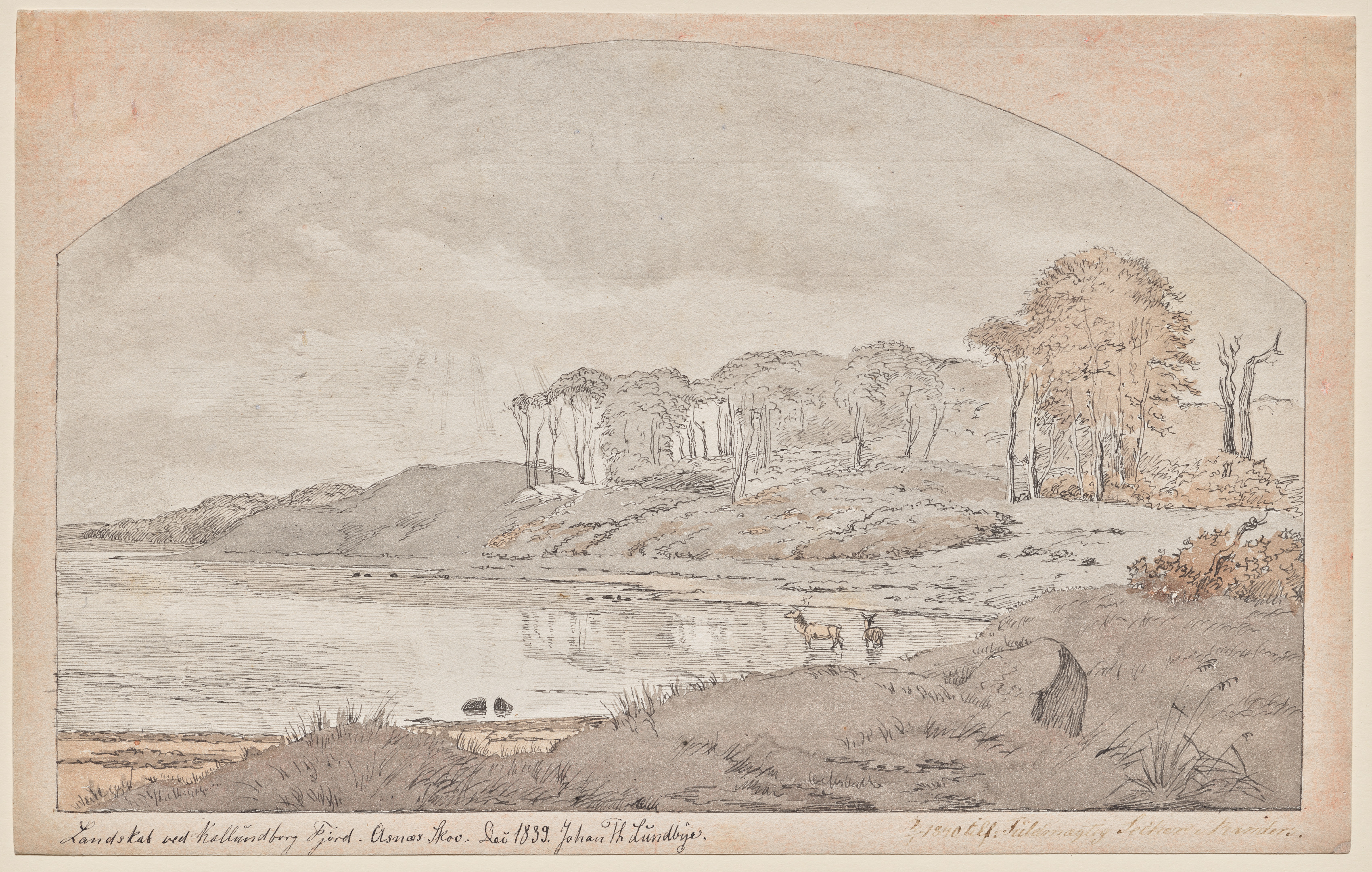 Sepia-toned drawing of a landscape. A body of water is on the left, with a shoreline and hills in the background. Trees and bushes are on the right side of the image, and two cows are standing on the shoreline. The sky is cloudy. The image is arched at the top and has a beige border. Writing is at the bottom.