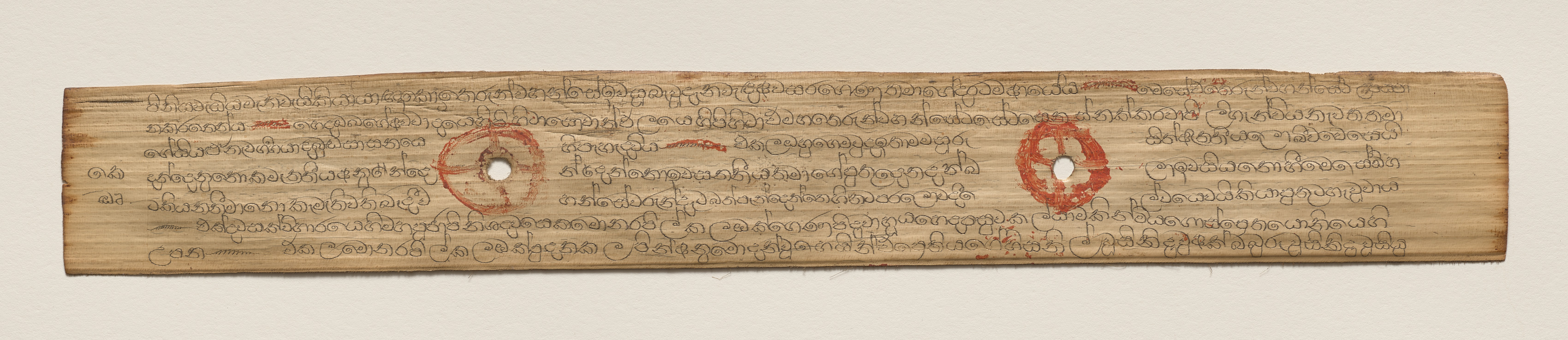 Rectangular, light-brown colored, wooden panel with rounded edges. Two red circles on the right and left sides, approximately one-third of the way in from each edge. Each circle surrounds a small circular hole through the wood. The surface of the wood contains numerous lines of curved, black writing. A few scattered, red marks. Light gray background. Title: Leaf from a Buddhist Manuscript (recto), Artist: Unknown.